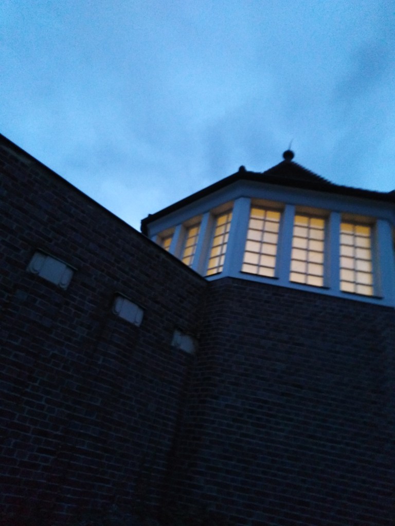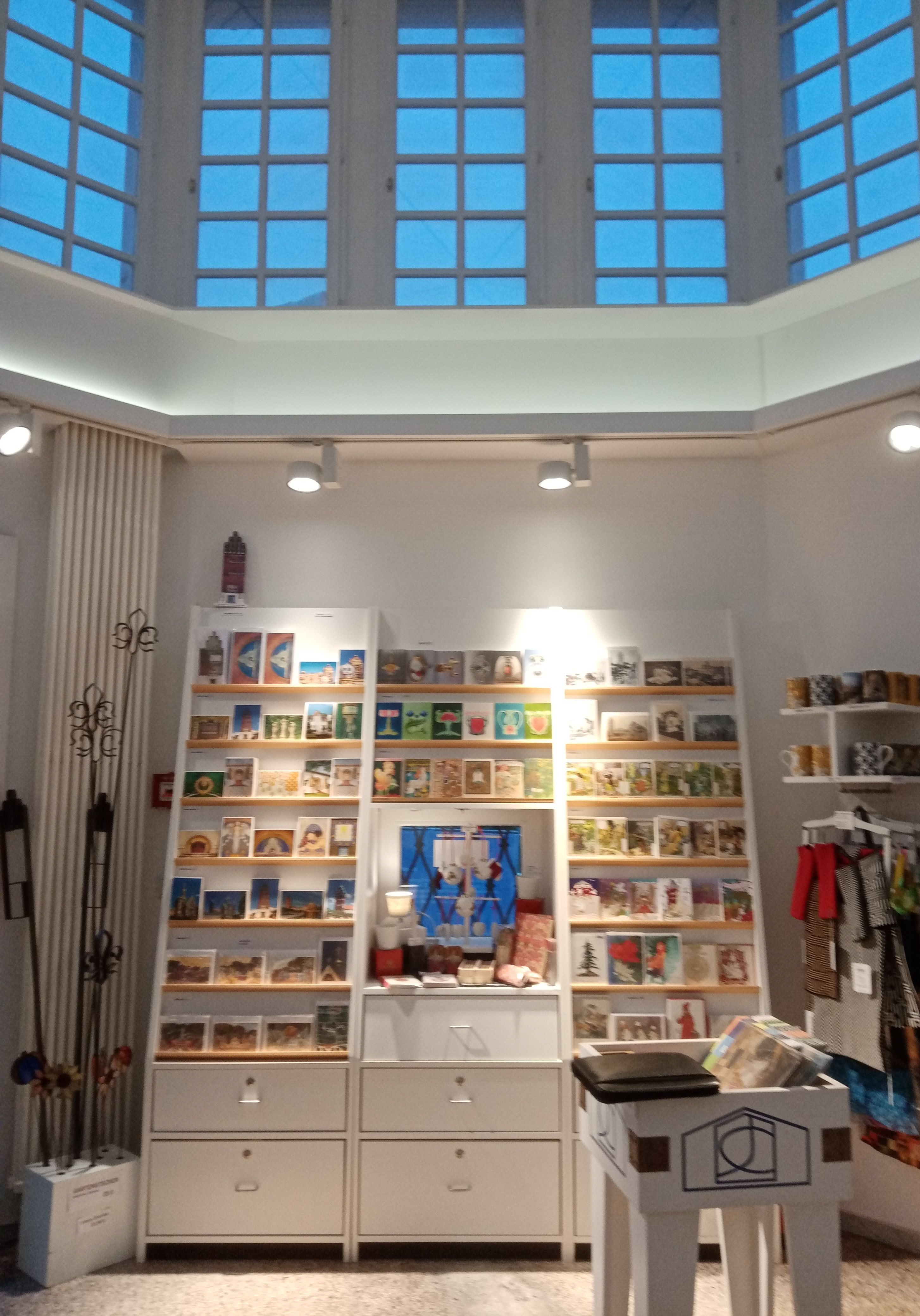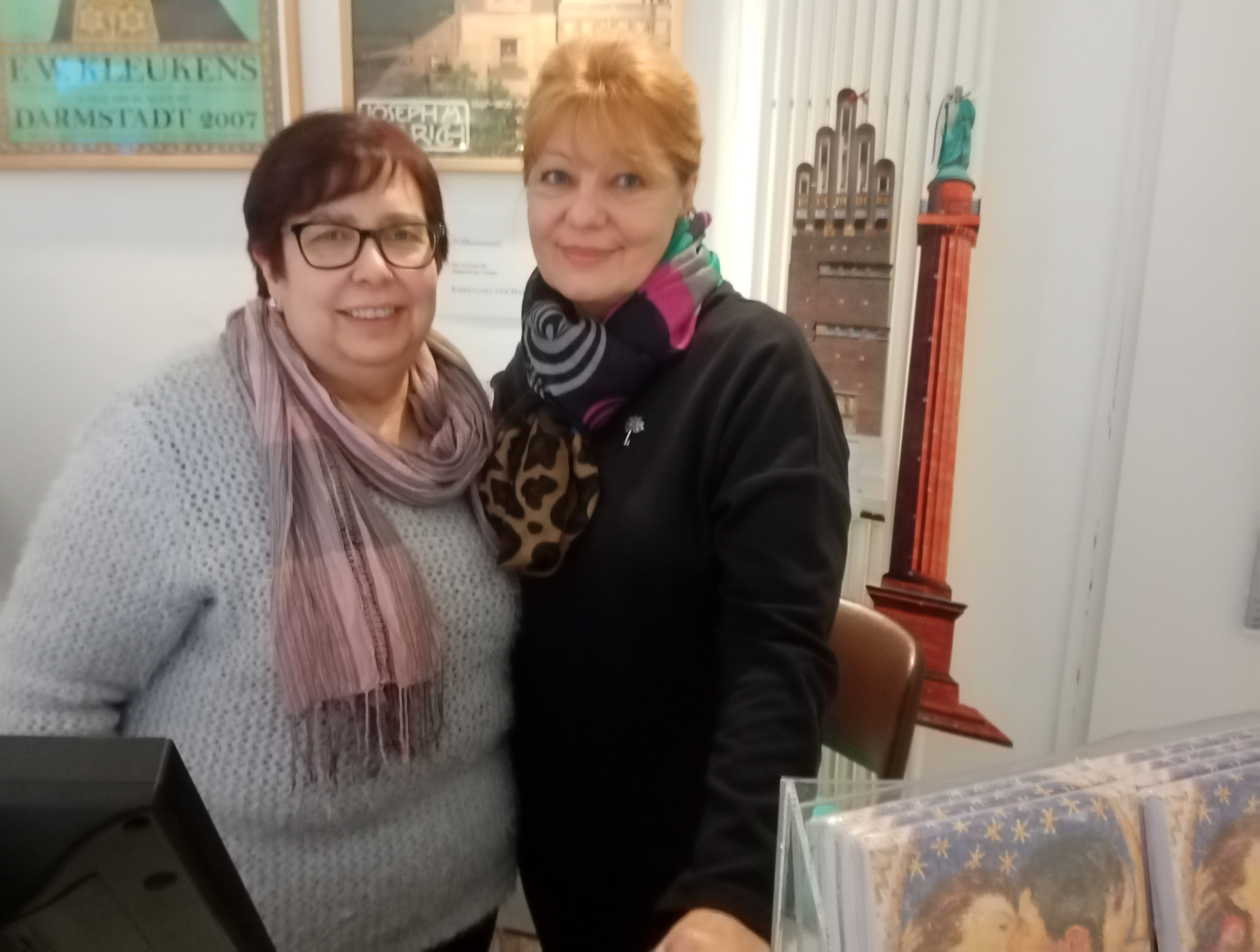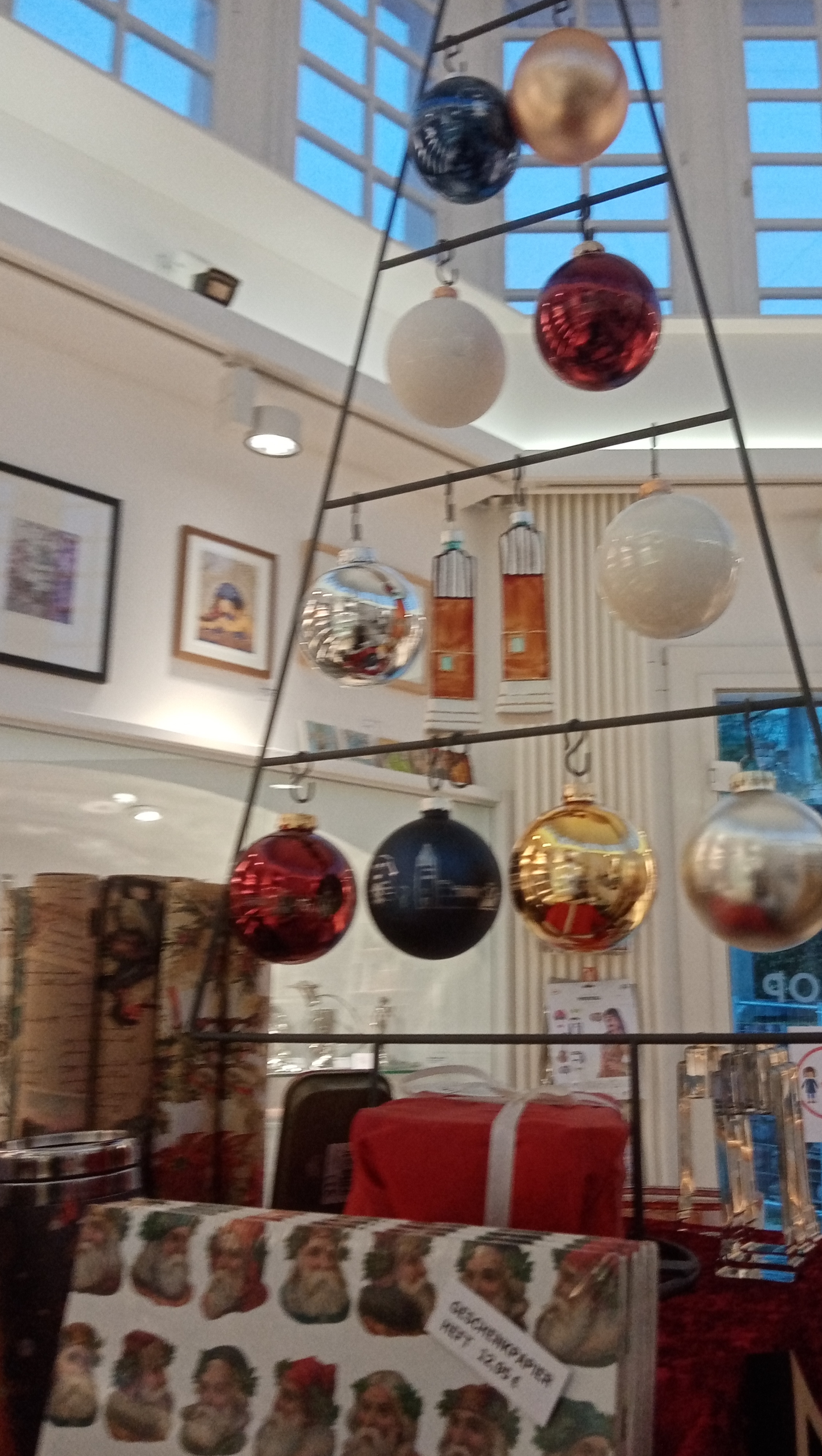 Hinein in die acht Ecken mit den wunderbaren Oberlichtern, die in herrlichstem Blau eines winterlichen Nachmittagshimmels den Raum beleuchten. Da ist er ja auch schon gleich in der Mitte: ein ganzer Tisch voll mit weihnachtlichem Dekor, Geschenkpapier und Karten. Von einem Baumgestänge hängen dicke Weihnachtskugeln und glänzen um die Wette, und an der Kasse stehen Concetta De Luca (links) und Liudmila Benz (rechts), die auch das rechte Bild vom Eingang oben zur Verfügung gestellt hat. Sie sind die guten Seelen des Museumsshops. „Ja, es ist schon relativ ruhig jetzt in der Corona-Zeit“ meinen sie. Bei geschlossenem Museum fehlen die Besucher der Ausstellungen. Aber es kommen dafür doch noch erstaunlich viele Menschen vorbei, momentan häufig auf der Suche nach einem Weihnachtsgeschenk oder schönen Karten. Gerne darf es momentan auch etwas kostspieliger sein: „Jetzt zur Weihnachten verkaufen wir deutlich mehr Jugendstil-Schmuck mit den Motiven unserer berühmten Künstler als sonst.“