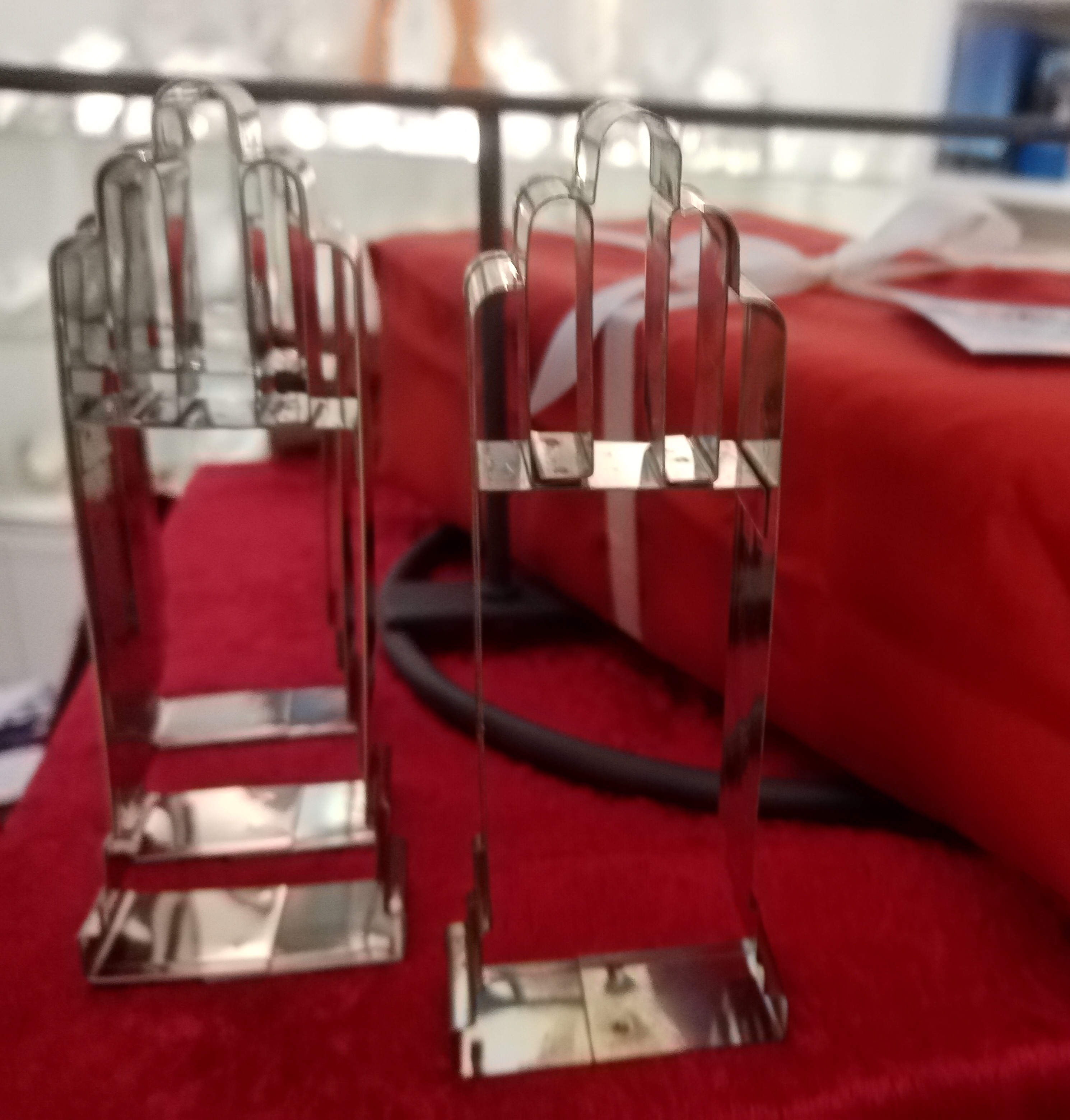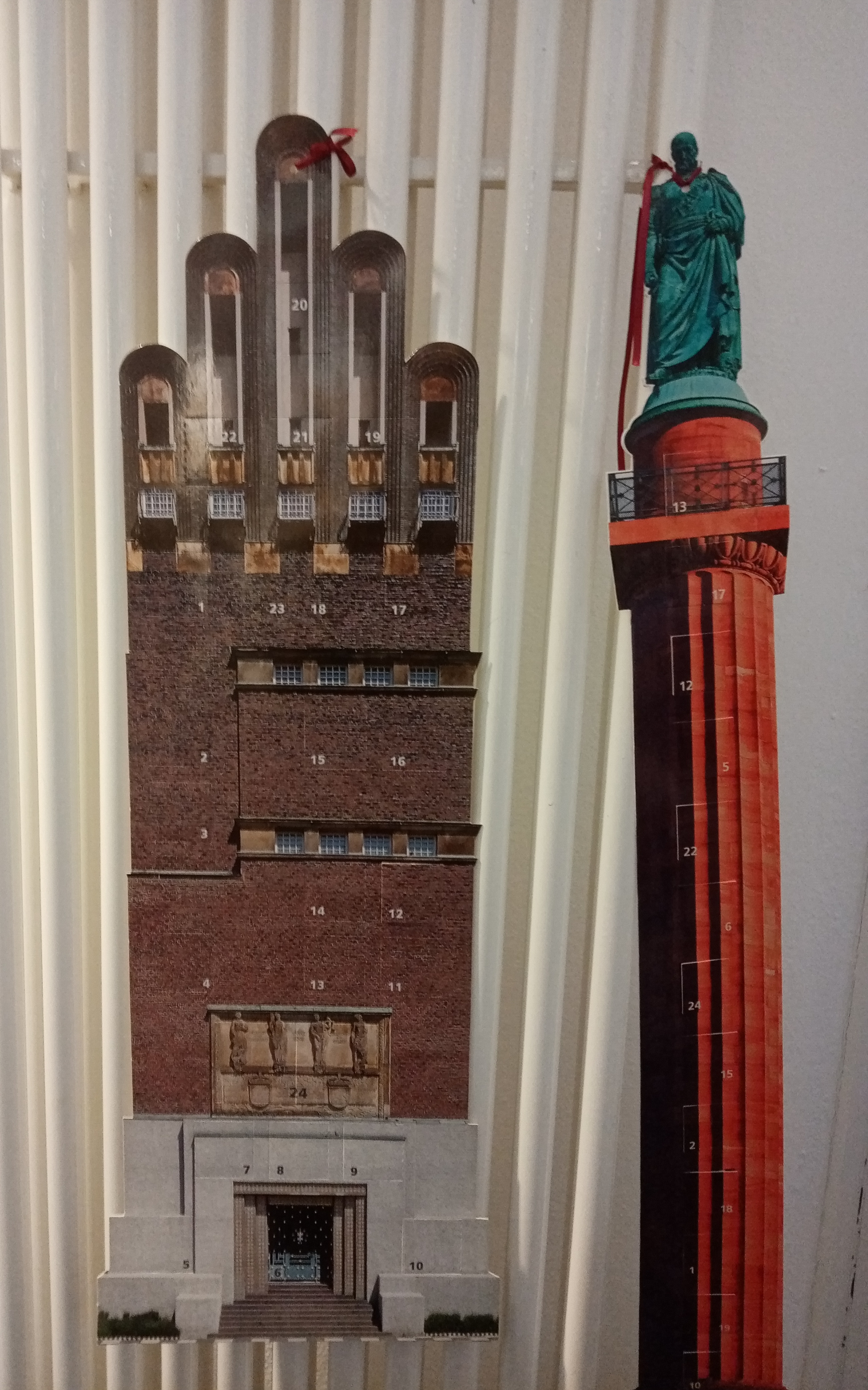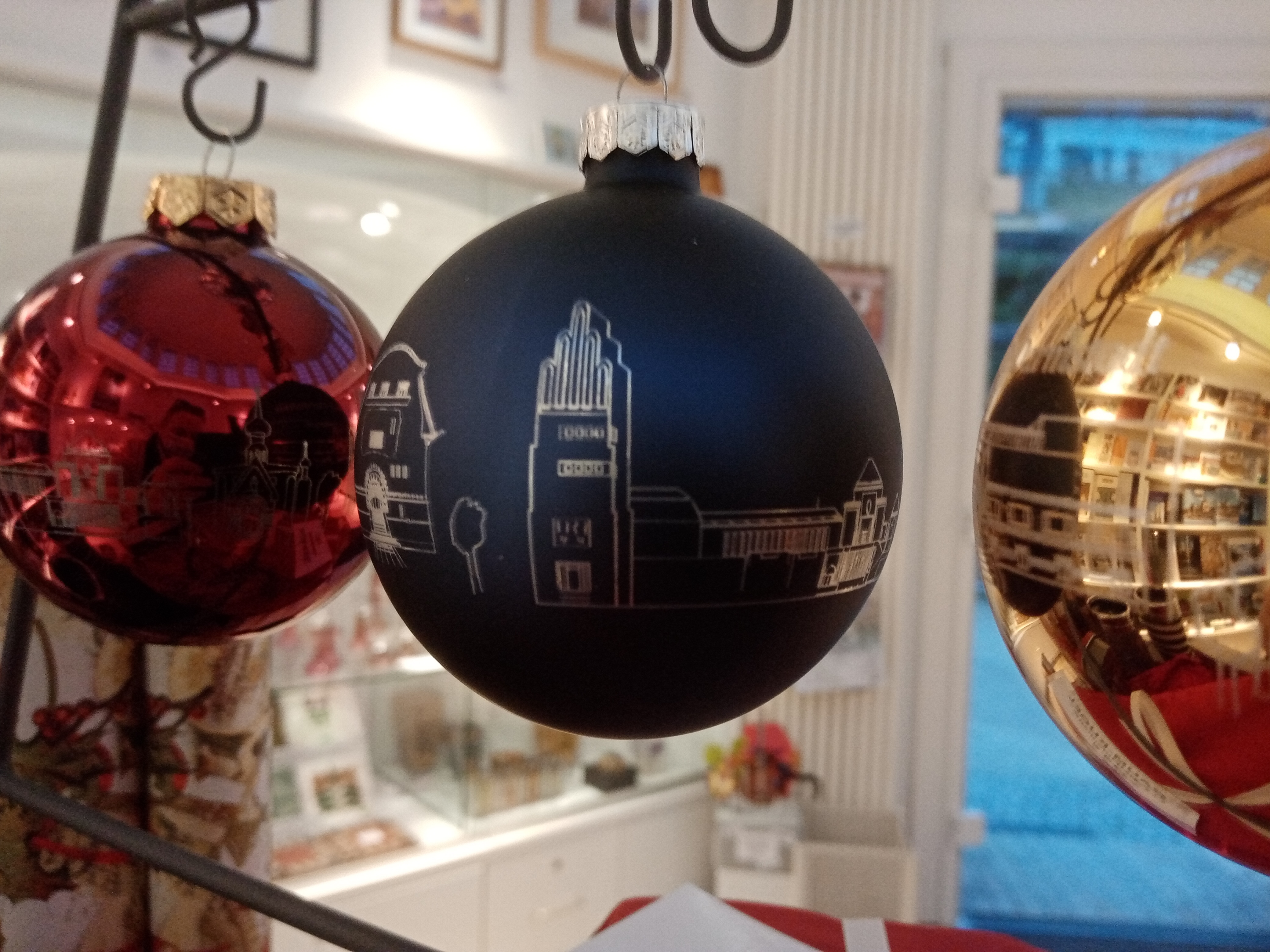 Der Hochzeitsturm nebenan ist nicht nur im echten Mathildenhöhen-Leben ein Hingucker, auch als weihnachtlich inspirierte Dekoration entfaltet er ungemein kreative Qualitäten: Er schmückt zusammen mit dem Ausstellungsgebäude der Künstlerkolonie als Bildmotiv bunte Weihnachtskugeln. Die sind in vielen verschiedenen Farben zu haben, selbstverständlich auch im weihnachtlichen Silber und Gold. Den Turm mit seinem markanten Fünf- Finger-Dach gibt es auch als langes Gehänge in Rotbraun mit Türkis – nicht nur in seinen Farben mit Sicherheit ein besonders auffälliges Schmuckstück am Weihnachtsbaum. Man kann sich dieses Modell auch sehr gut als Solitär an einem grünen Tannenzweig vorstellen und damit als perfektes Mitbringsel in der Adventszeit. Fast einen halben Meter hoch präsentiert er sich dagegen als überdimensionaler Adventskalender mit 24 Türchen in der berühmten Backsteinfassade neben einer deutlich schmaleren Version vom „Langen Lui“ mit der Säule, die der Museumsshop ebenfalls im Angebot hat. Ausgesprochen beliebt und am Ende meistens auch sehr köstlich ist das Darmstädter Wahrzeichen als Ausstechform für Plätzchen.