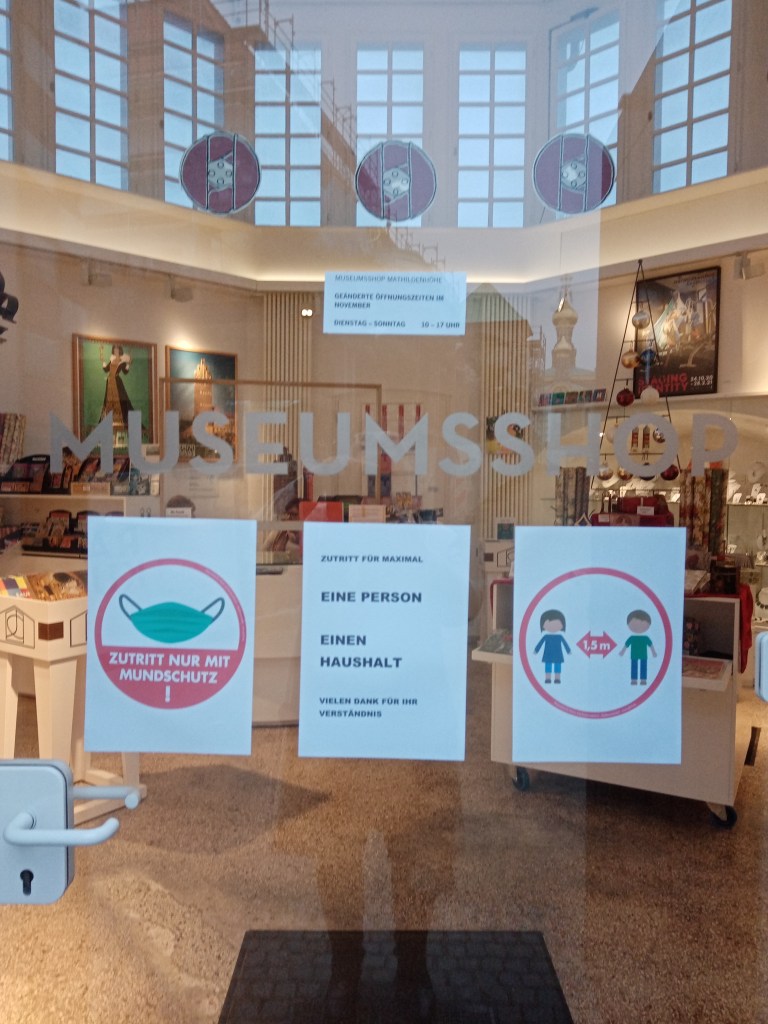 So, jetzt müssen wir langsam raus. Die nächste Dame wartet schon draußen! Wer nochmal vorbei kommen will zum Stöbern, der kann das jederzeit von dienstags bis sonntags von 11 bis 18 Uhr tun – vorbehaltlich neuerer Corona-Lockdown-Regelungen. Die beiden Damen vom Museumsshop haben natürlich nur für das Foto ihre Corona-Schutzmasken abgenommen.