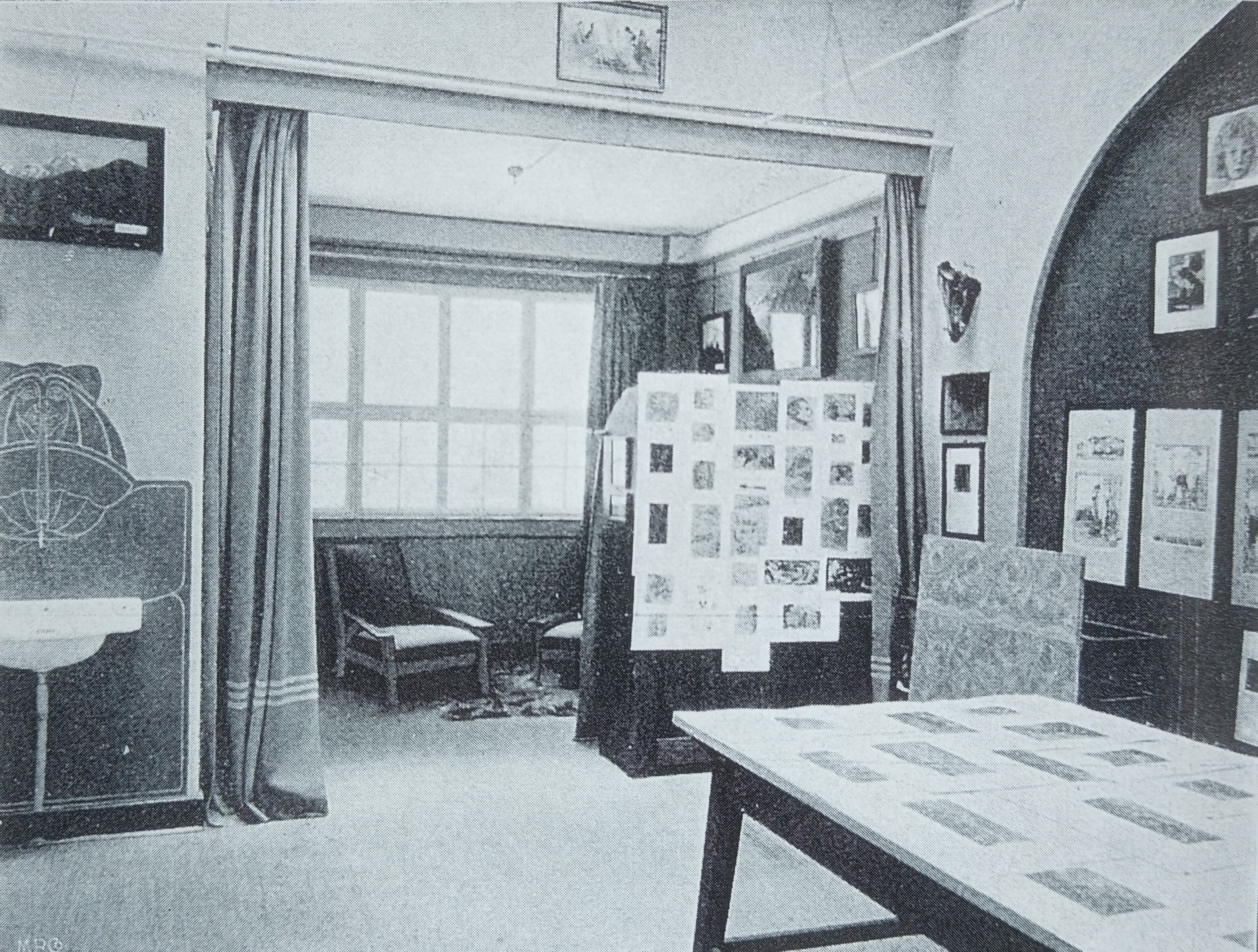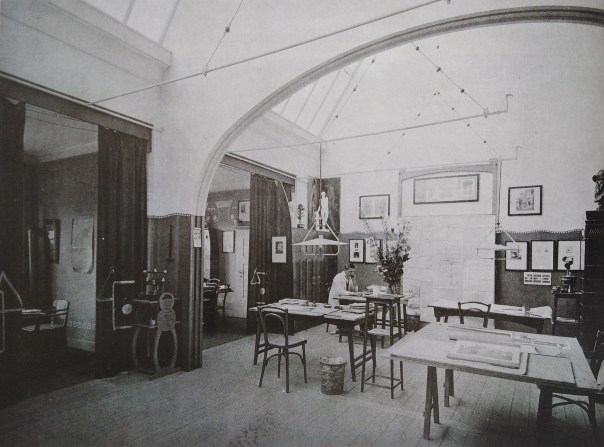 Original-Bildansichten von drei der sieben Ateliers der berühmten ersten Künstlerkolonie haben sich bis heute erhalten: Im Westen ist es das Atelier von Hans Christiansen, das man sehr gut am mit Rosen bestickten Vorhang erkennen kann, der die Meisterstube vom Hauptraum trennt. Dann das Atelier von Paul Bürck gleich daneben, dessen Wände mit Skizzen und Zeichnungen des Künstlers behangen sind. Im Osten ist das große Doppel-Atelier von Olbrich in mehreren Bildausschnitten überliefert, die nicht nur Möbel, sondern auch Menschen bei der Arbeit zeigen. Dieser hier liefert einen guten Raumeindruck vom Olbrich-Büro: Viele Arbeitstische sind zu erkennen, die Möblierung, der große Kachelofen rechts, die Holzdiele und auch die Dekoration des Ateliers.