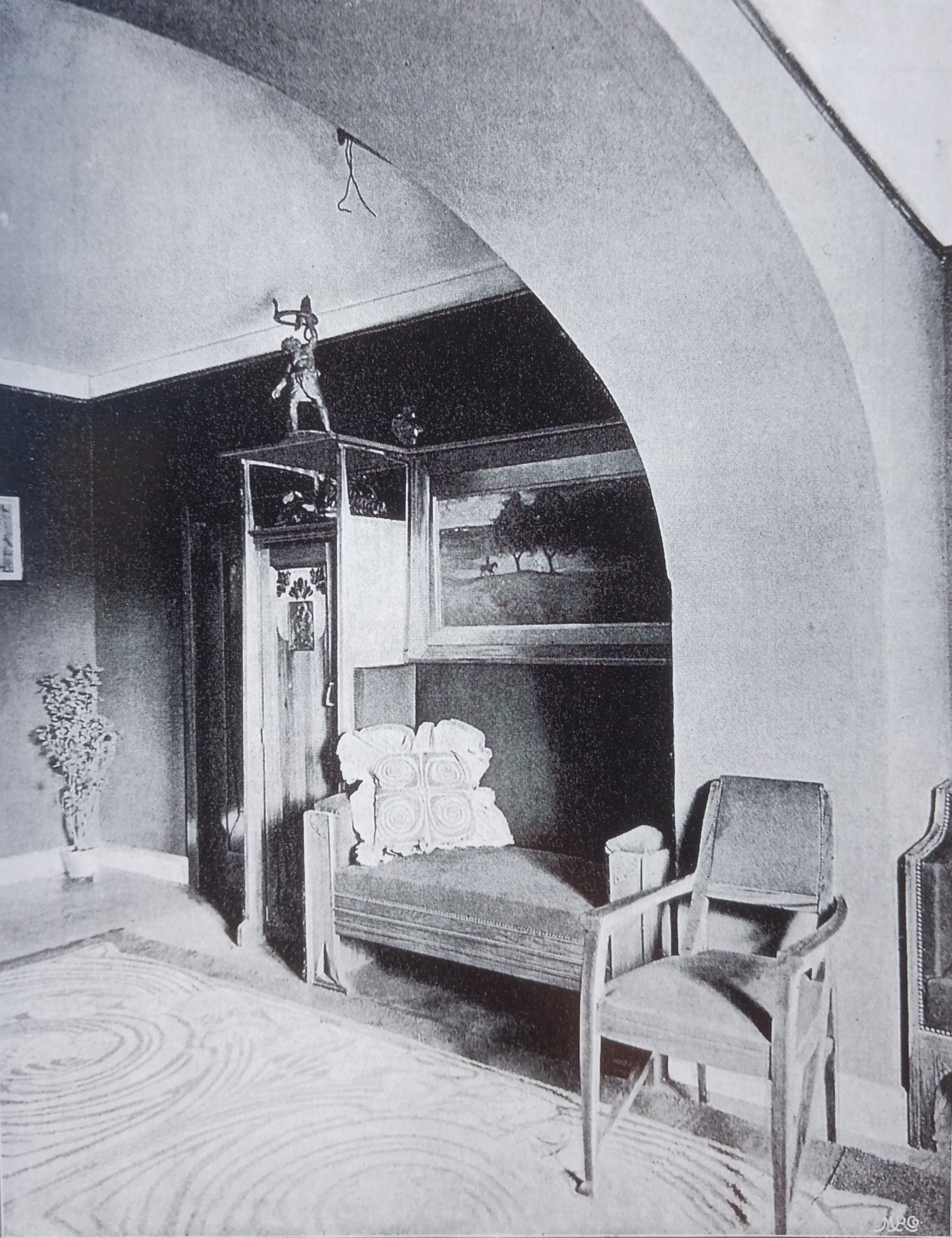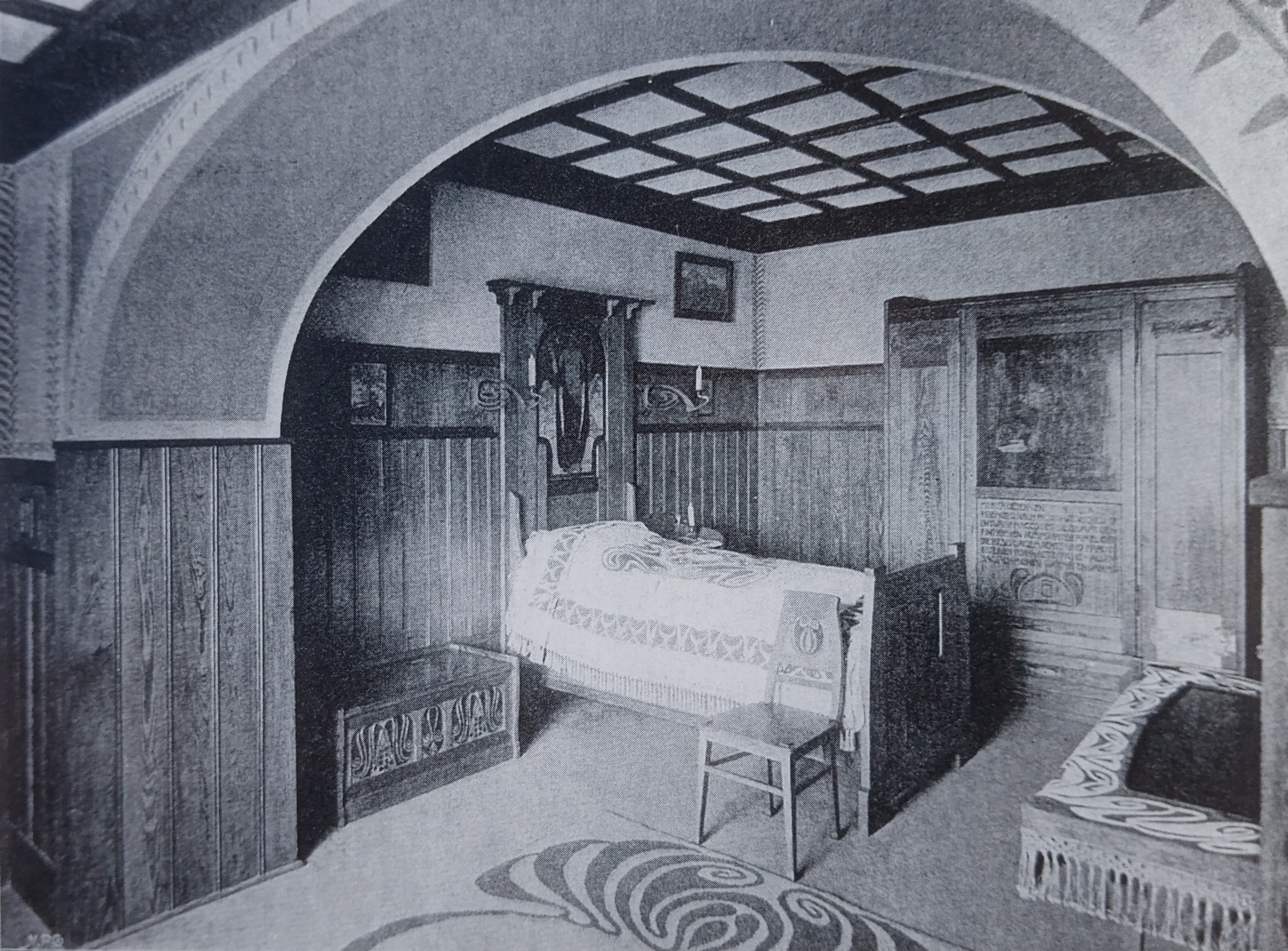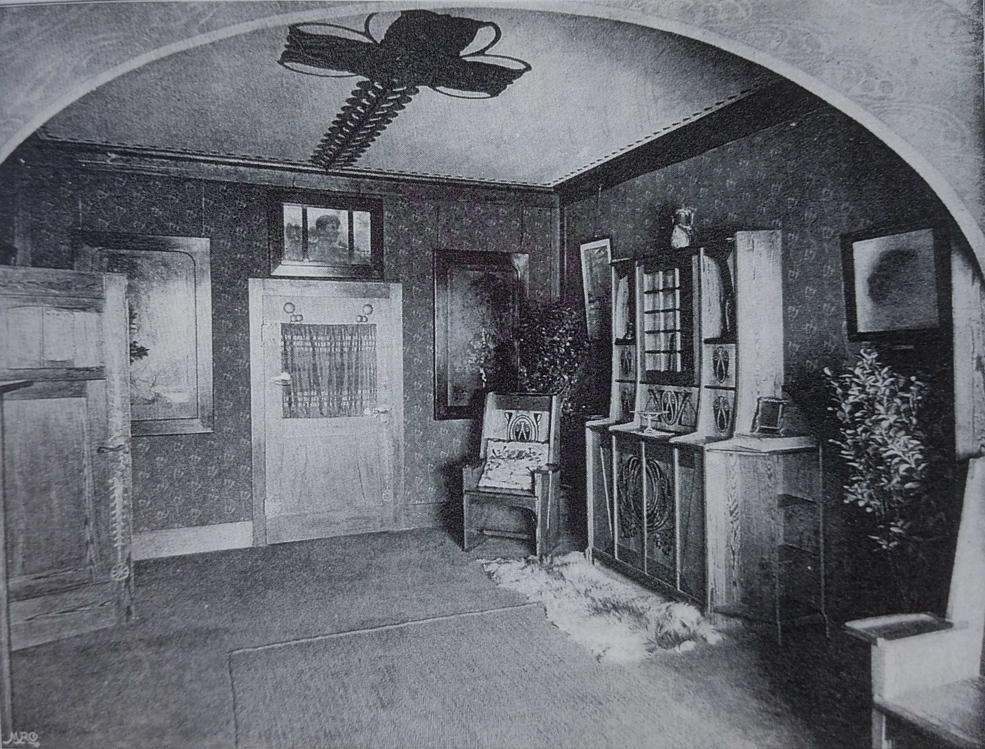 Ganz schön kritische Worte! Sie gelten dem Untergeschoss des Ernst Ludwig-Hauses und sind in einem dicken Ausstellungsband zu finden, in dem der bekannte Verleger von Kunstzeitschriften, Alexander Koch, 1901 bereits die Darmstädter Premiere zusammenfasste, vorstellte und bewertete. Olbrich was not amused! Doch diese herbe Kritik an seinem an anderer Stelle absolut genialen Ernst Ludwig- Haus muss er sich bis heute gefallen lassen. Denn während man einen Stockwerk höher über einen von vielen Fenstern gesäumten, außen liegenden, hellen Korridor die Ateliers erreicht, erfolgt die Anbindung der unteren Zimmer über einen fensterlosen Flur, der sich im Inneren fast über die ganze Länge des Ateliergebäudes zieht. Durch eine Eingangstür an der östlichen Schmalseite des Gebäudes erhält man Zugang zu dem Flur und seinen an ihm liegenden Räumen.