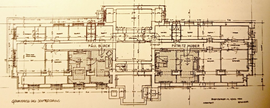 Zu Olbrichs Verteidigung muss man hier sagen, dass Wohnungen im Untergeschoss des Ateliergebäudes ursprünglich nicht vorgesehen waren, sondern lediglich Verwaltungs- und Wirtschaftsräume. Die Etage wurde erst nachträglich umfunktioniert, um den beiden jüngsten Mitgliedern der Künstlerkolonie Wohnraum zu geben, was man in den Plänen (hier eine Rekonstruktionszeichnung des Darmstädter Hochbau- und Maschinenamtes von 2000) und den zeitgenössischen Bildern auch deutlich erkennt. Paul Bürck und Patriz Huber waren gerade mal Anfang zwanzig und konnten sich die hohen Baukosten für eine eigene Künstlervilla wie die Älteren und Arrivierteren in ihrem Kreis nicht leisten. Auch ein anderer Künstler der Damstädter Kolonie, Rudolf Bosselt, hatte kein eigenes Künstlerhaus auf der Mathildenhöhe. Das für ihn ursprünglich gedachte, spätere Kleine Glückert Haus, konnte er finanziell nicht stemmen. Sein Name taucht in den Plänen für das Untergeschoss des Ernst Ludwig-Hauses jedoch nicht auf, er muss anderswo seine Bleibe gehabt haben.