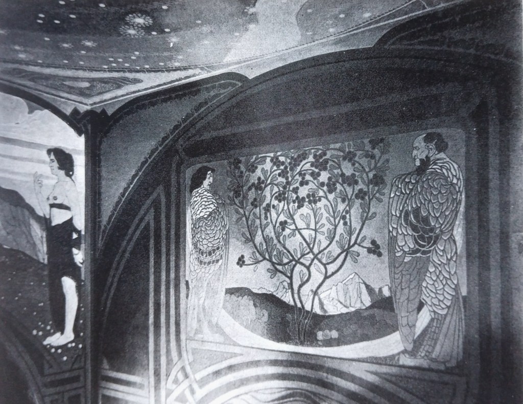 Sehr aufhellend war auch nicht gerade die Innendekoration und Wandbemalung des zentralen Innenraums, die in ihrer Erstausstattung vom Jüngsten der Künstlergruppe, von Paul Bürck, stammte. Dieser dekorierte die vier Wände über den Rundbögen und der Galerie über dem Eingang mit allegorischen Motiven zu Kunst und Wissen, die Blüten und Früchte trugen. Die Decke zierte ein Nachthimmel mit Mond, Sternen und der Milchstraße.