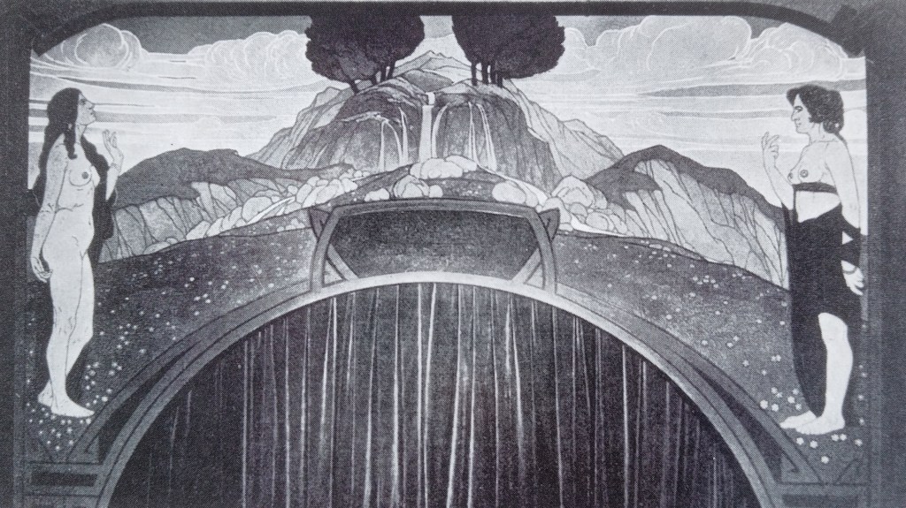 Material, Farben und Gemälde waren zur Ausstellung von 1901 eher dunkel gehalten, und bildeten in ihrer Schwere einen sehr starken Kontrast zu der Leichtigkeit des gesamten Ateliergebäudes. Was mag Meister Olbrich dazu wohl gedacht haben? Er hatte selbst einige Entwurfszeichnungen für die Ausgestaltung der Halle angefertigt. Schon diesen Skizzen ist anzusehen, dass Olbrich hier wesentlich mehr Helligkeit, Leichtigkeit und Glamour hereingebracht hätte.