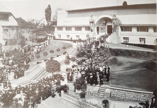 Heute vor exakt 120 Jahren war nicht nur das Wetter deutlich besser in Darmstadt, auch auf der Mathildenhöhe ging es an diesem Tag besonders festlich zu: Denn am 15. Mai 1901 wurde das Ernst Ludwig-Haus feierlich eingeweiht und zugleich die erste Ausstellung der Darmstädter Künstlerkolonie eröffnet. Die lange Treppe hinauf zum weißen „Tempel der Arbeit“ wurde förmlich zu einer Prozessionsstraße über die man nach dem Ende des feierlichen Weihespiels gemeinsam hinaufzog zum ganz in Gold glänzenden Eingang: vorbei an kolossalen Figuren aus Stein links und rechts, unter goldenen Lorbeerkränzen durchschreitend, die zwei schmale Damen aus Bronze über die Köpfe der Eintretenden hielten, hinein in den „heiligen Schrein“. Denn so muss es allen Beteiligten an jenem herrlichen Frühlingstag vorgekommen sein: Als habe man einem Gottesdienst beigewohnt und betrete nun das Allerheiligste.