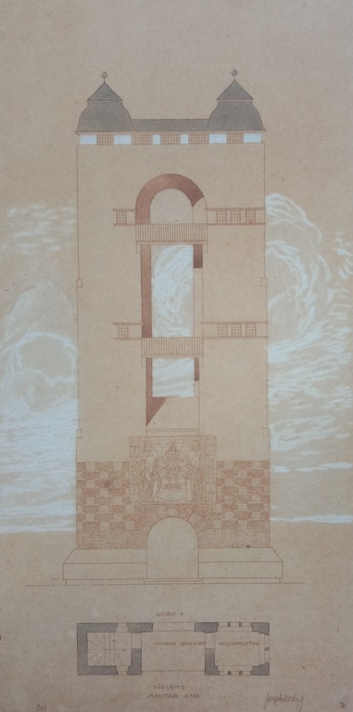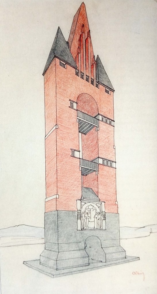 Eine weitere Quelle ist Mathildenhöhe Darmstadt (Hrsg.): Joseph M. Olbrich, 1867 – 1908. Katalog zur Ausstellung anlässlich des 75. Todestages von Olbrich. Konzeption: Bernd Krimmel, Sabine Michaelis, Darmstadt, 1983. In dem Band sind auf Seite 48 auch die drei frühen Entwürfe für den Hochzeitsturm zu sehen, die für diesen Beitrag abfotografiert wurden. Desweiteren wurden aus diesem Werk die folgenden zwei Kapitel genutzt: