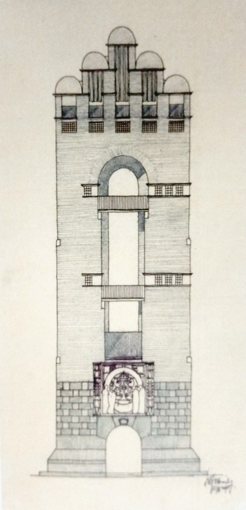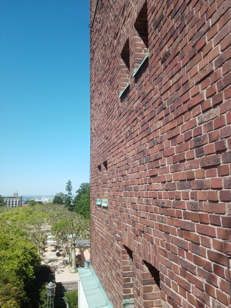 Da riefen mich die Arbeiter herauf, weil Olbrich klagte, die Mauern sähen so glatt und hart aus. Ich probierte mit ihnen herum. Zuletzt fand ich die Art heraus, wie man die Ziegel ganz unregelmäßig aneinander legen müsse. Olbrich kam und war sehr zufrieden über die Bauart. So ist der Hochzeitsturm eigentlich von mir aus gemacht worden.
