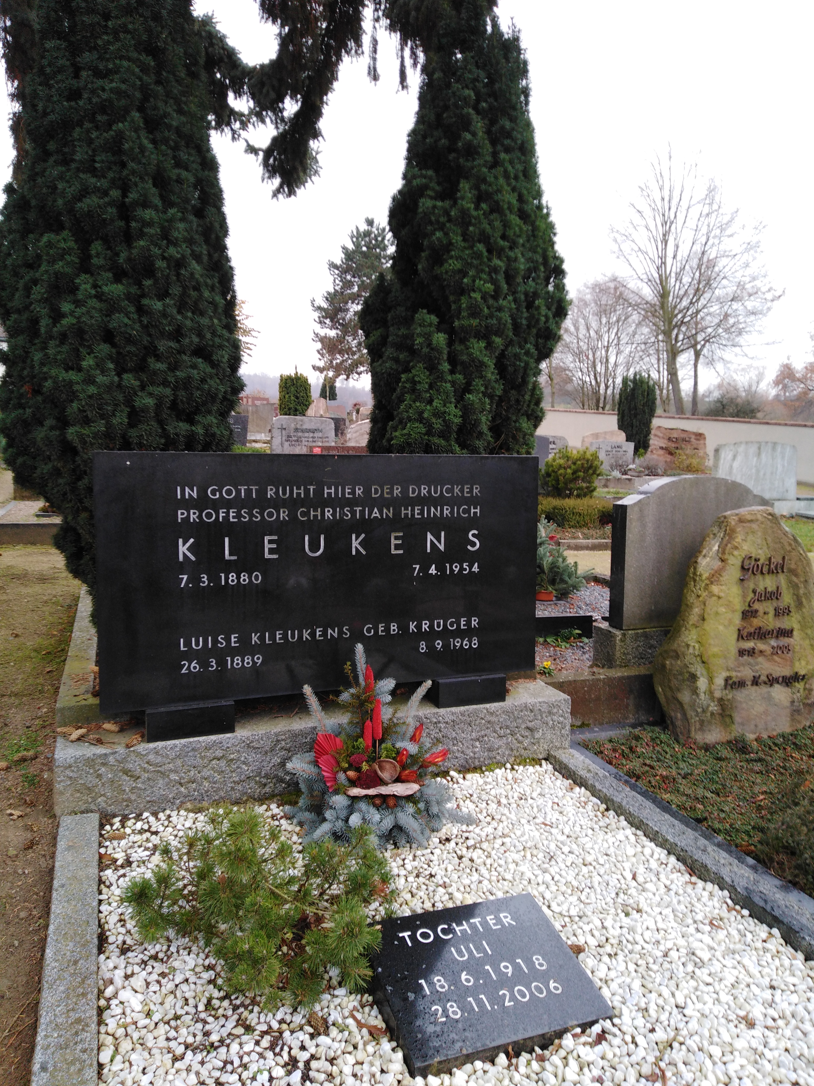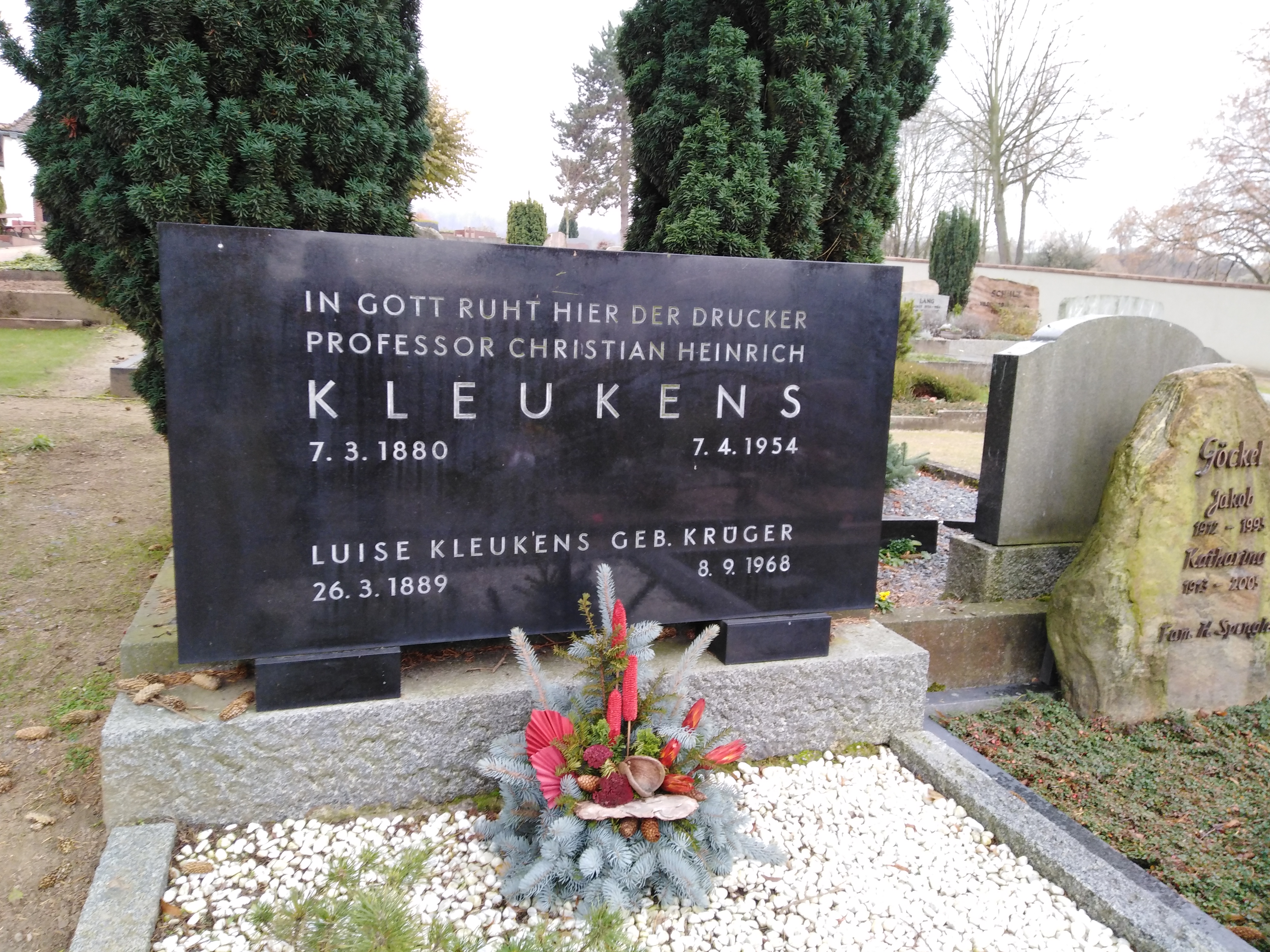 Christian H. Kleukens gehörte zu den letzten Mitgliedern der Künstlerkolonie Darmstadt. Er wurde erst 1914 als Nachfolger seines älteren Bruders und langjährigen Leiters der Ernst Ludwig-Presse in den illustren Kreis aufgenommen, auch wenn er dort schon viele Jahre die Drucktechnik verantwortet hatte. Zuhause war er in der heutigen Gemeinde Mühltal, wo er als einer der Mitbegründer der Trautheimer Gartenstadt gilt. Für die Leitung der Gutenberg-Presse und eine Professur zog es ihn 1927 nach Mainz, von wo er nach dem Ende des Zweiten Weltkriegs wieder zurückkehrte. Er starb am 7. April 1954 und wurde auf dem Friedhof in Mühltal/Nieder-Ramstadt begraben. Sein schwarzer und polierter Grabstein formt mit scharfer Kante ein breites Rechteck. Die Lettern der elegant-modernen Schrift zeugen von der Profession des Verstorbenen, dessen Leben der Typografie und der Kunst des Druckens gewidmet war.