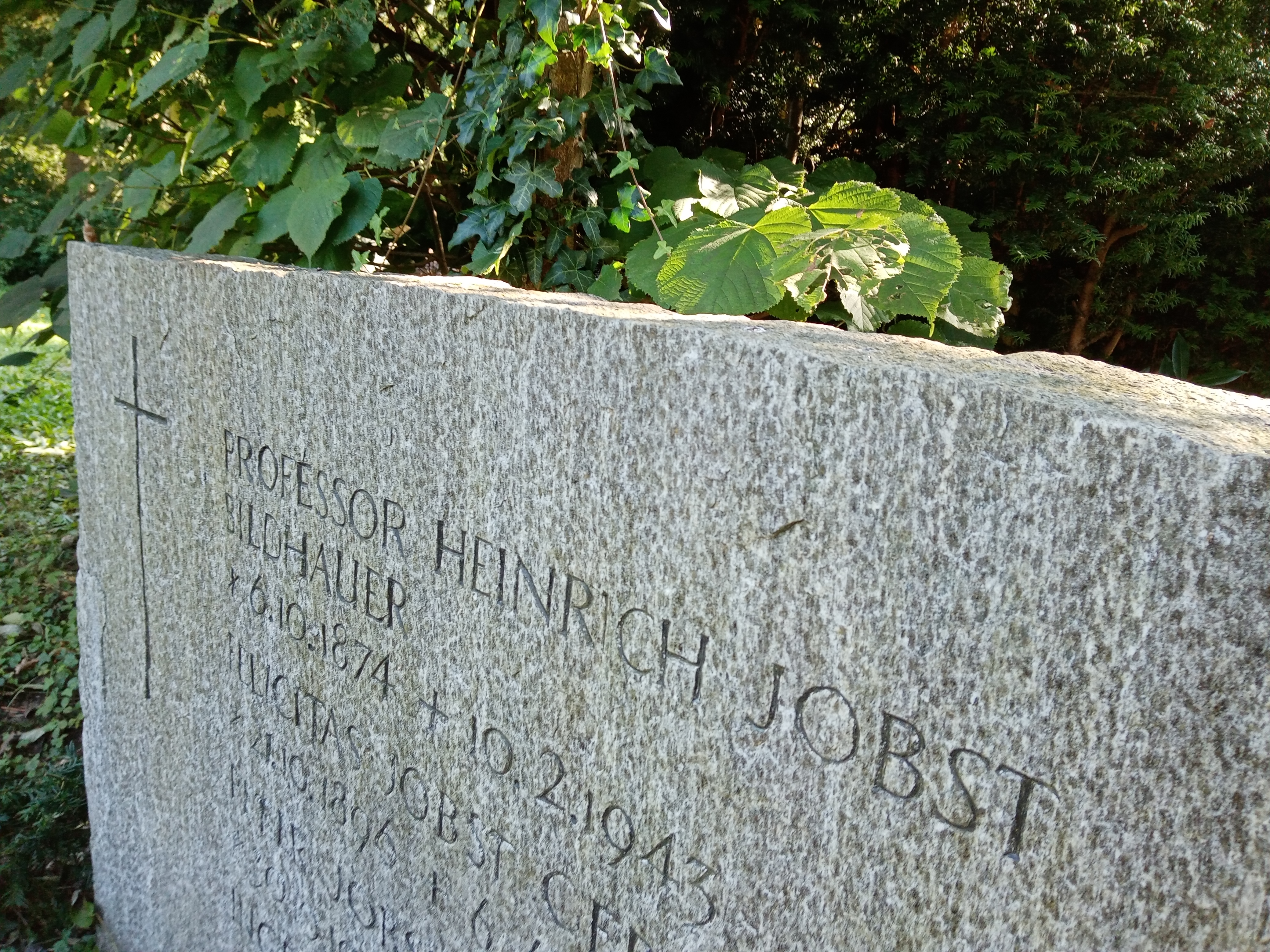 Den bezaubernden Grabstein für Olbrich auf dem Alten Friedhof (IV C 11) hat Jobst 1908 ebenfalls gestaltet. Sein eigener von 1943 ist dagegen eher schlicht gehalten. Außer dem Schriftzug deutet nichts darauf hin, dass hier ein überragender Künstler seines Fachs begraben liegt (II O 172b). Da geht es ihm ähnlich wie seinem Vorgänger in der Künstlerkolonie, dem Bildhauer Ludwig Habich, dessen Grabstein nur wenige Meter entfernt (I D 121a) auch nicht durch besondere künstlerische Bearbeitung auffällt.