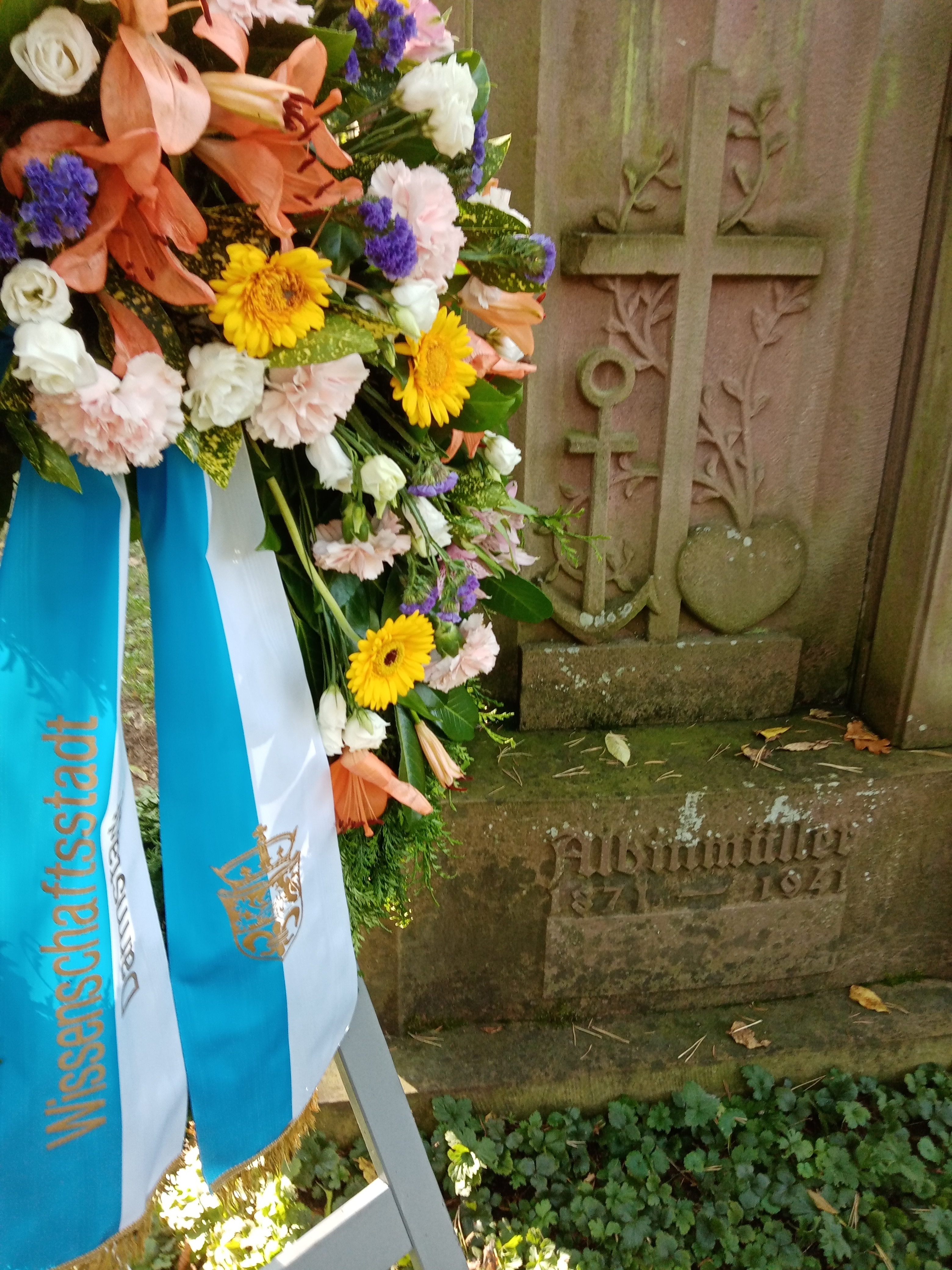 Vor etwa einem Monat, am 2. Oktober, hatte Albin Müller seinen achtzigsten Todestag, den die Stadt Darmstadt mit einem Kranz an seinem Grab ehrte. Dem Chefarchitekten der späteren Künstlerkolonie und Leiter der Ausstellung von 1914 ist mit albinmüller3 gerade auch eine Sonderausstellung des Institut Mathildenhöhe Darmstadt gewidmet. Von seinem Ruf an die Künstlerkolonie 1906 bis zu seinem Tod 1941 im Alter von 69 Jahren hat Albin Müller in Darmstadt in seiner Villa direkt am Platanenhain gelebt. Er ist auf dem Darmstädter Waldfriedhof begraben. Bemerkenswert ist, dass er mit Anfang Vierzig seinen Grabstein selbst entworfen hat: Zwischen 1914 und 1916 hat er daran gearbeitet, ganze 27 Jahre vor seinem Tod und nach Ausbruch des Ersten Weltkriegs, der der Darmstädter Künstlerkolonie ein plötzliches und unerwartetes Ende setzte. An seinem eigenen Grabmal finden sich mit Kreuz, Herz und Anker die drei Symbole wieder, die er 1914 auch für die goldene Uhr des Hochzeitsturms gestaltete: Glaube, Liebe, Hoffnung.