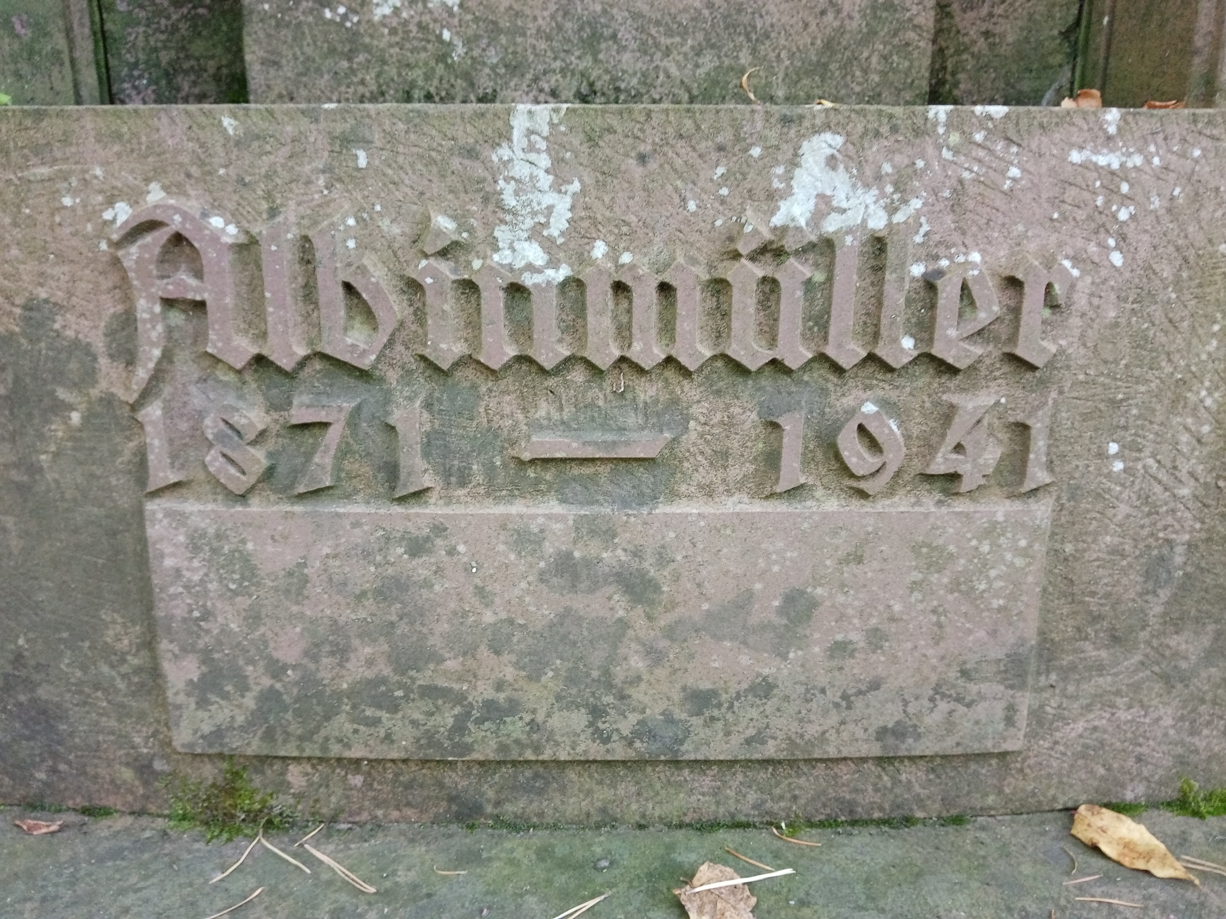 Das Grab von Albin Müller liegt tief im Waldfriedhof versteckt: Ganz am westlichen Rand des großen Runds hat er seine ewige Ruhe gefunden (L 9c: 178). In den letzten Jahren seines Lebens hat er sich sehr mit Malerei und Naturlandschaften beschäftigt. Vielleicht ist dieses Grab so weit entfernt von den Menschen ein Ausdruck einer gewissen Zivilisationsmüdigkeit. Besonders auffällig ist auch die Positionierung der Grabstätte zum Hauptweg. Das Grabmal Albin Müllers wendet sich mit dem Rücken zum vorbeilaufenden Besucher. Die Schauseite ist nach Osten gerichtet: Richtung Mathildenhöhe.