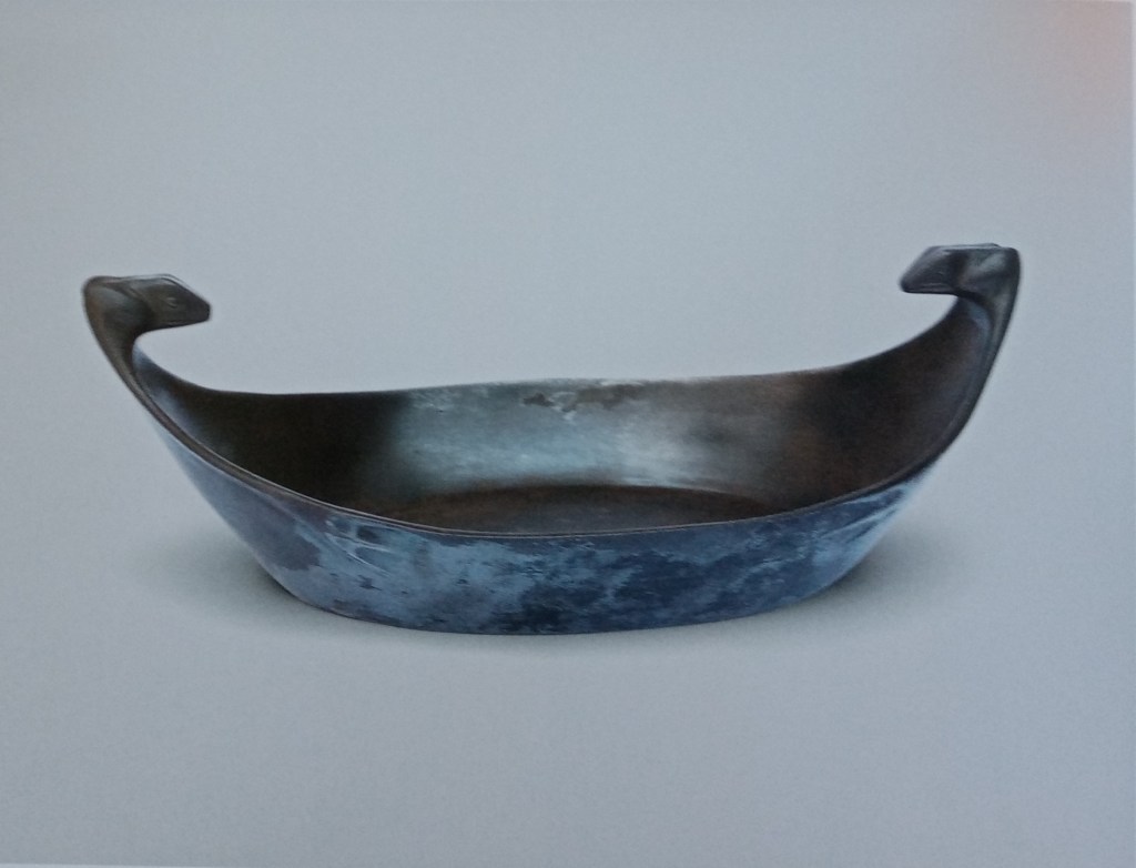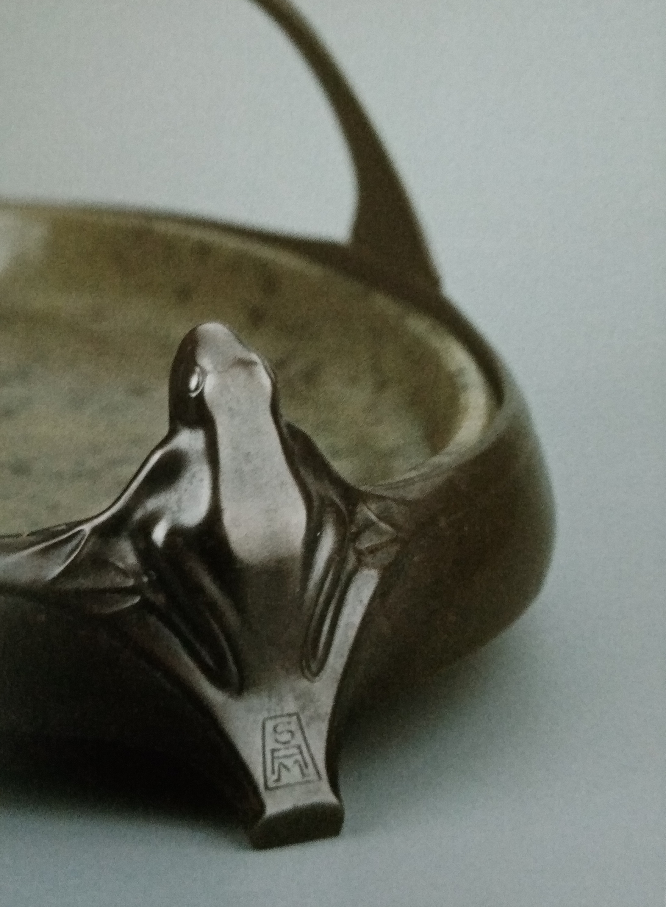Nochmal ein Katzenpaar von Müller: Hier sind die Tiere stark stilisiert und übernehmen in ihrer aufgebrochenen Form die Funkion von zwei seitlich angebrachten Griffen, die dieser flachen Schale mit einem Inlay aus Serpentinstein eine ausgesprochen expressiv moderne Anmutung geben: