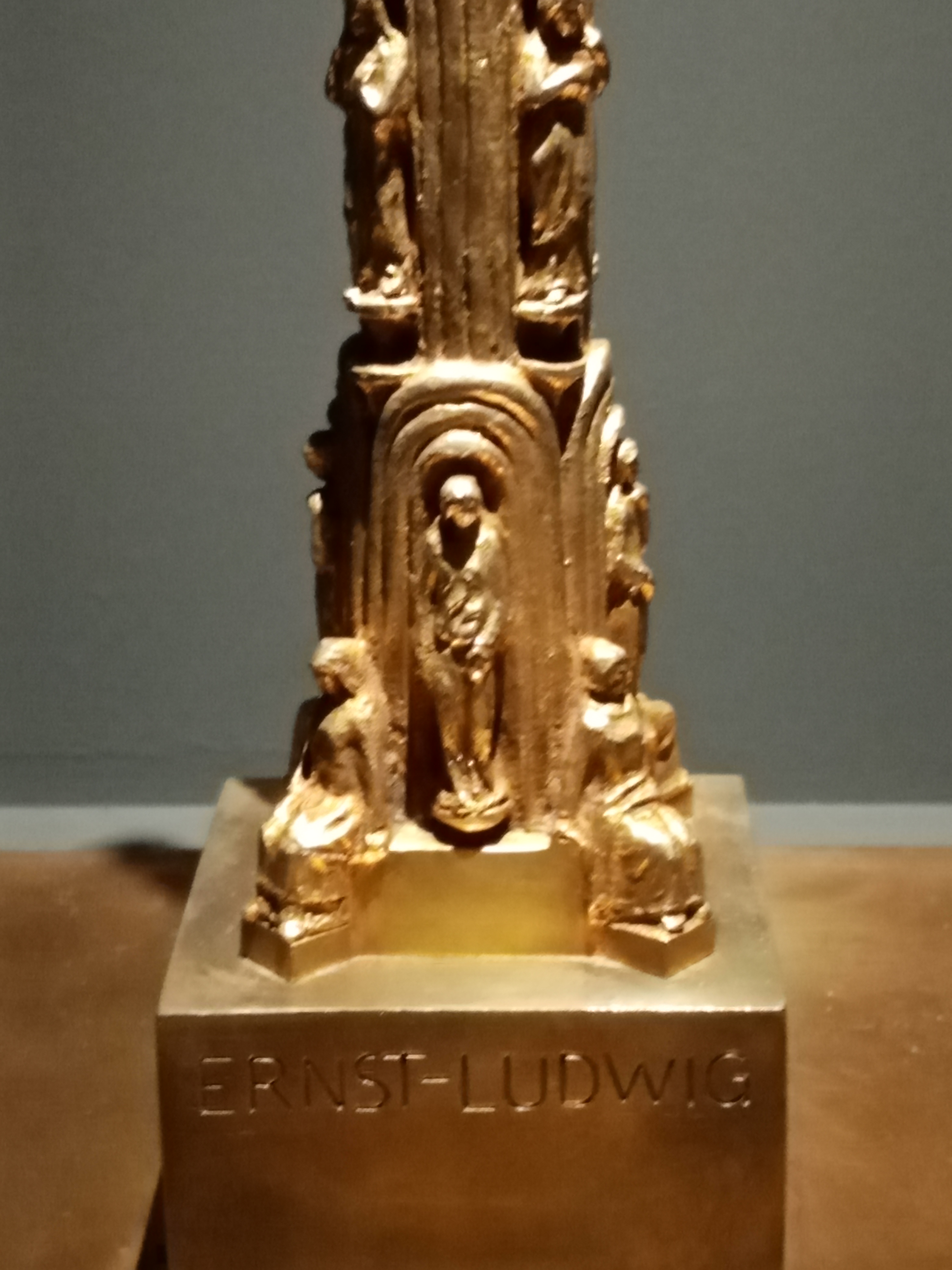Die Flugreise zur Hochzeit nach London sollten seine drei Gäste nicht überleben. Das Flugzeugunglück vom 17. November 1937 in Ostende bedeutete eine familiäre Katastrophe und löschte nahezu alle Mitglieder der großherzoglichen Dynastie aus. Erhalten geblieben von diesen schrecklichen Tagen im Herbst 1937 ist aber diese Zeichnung sowie ein etwa 80 Zentimeter hohes Modell aus schimmernder Bronze, das Albin Müller von der Denkmalssäule auf der Mathildenhöhe angefertigt und den Familienmitgliedern während des letzten Treffens wohl auch gezeigt hat. Es besitzt über einen Sockel mit der Namensinschrift Ernst-Ludwig sieben sich nach oben verjüngende Segmente, die als umlaufendes Band mit figürlichen Darstellungen gearbeitet sind.