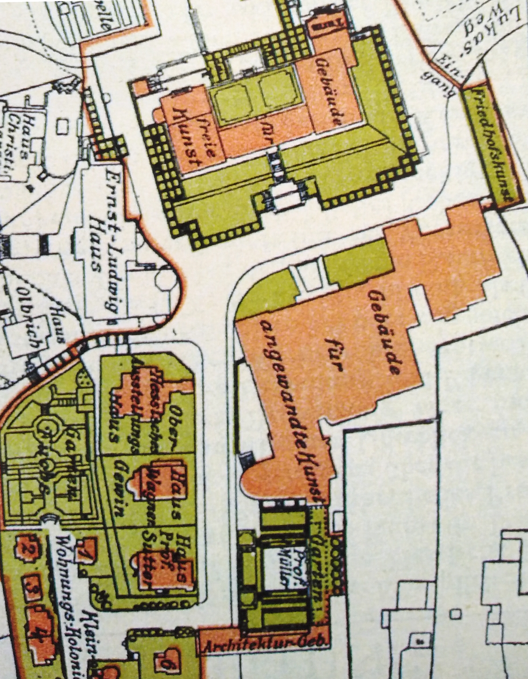 Modell und Plan vom Osthang 1908: Die Gartenterrassen mit dem quadratischen Wasserbecken sowie das großflächige „Gebäude für angewandte Kunst“ mit seiner oval abschließenden Ladengalerie sind gut zu erkennen. Sämtliche Bauten nördlich der zentralen Achse (im Plan oben rechts liegend) sowie das „Gebäude für Architektur“ (im Plan als orangefarbener Querriegel am unteren Ende zu sehen) wurden von Albin Müller entworfen. Sie waren von Anfang an als temporäre Gebilde geplant und daher nur während der Hessischen Landesausstellung von 1908 zu besuchen. Ganz anders als das ebenfalls 1908 fertig gestellte „Gebäude für freie Kunst“ mit Hochzeitsturm von Joseph Maria Olbrich, das bis heute steht und als Wahrzeichen das Stadtbild Darmstadts prägt.