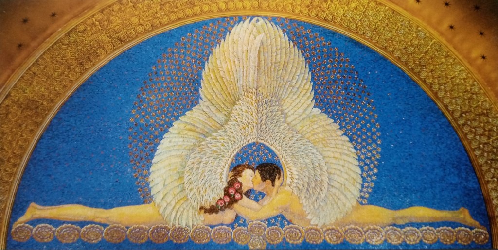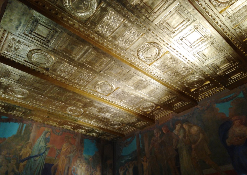 Dringend war auch die Sanierung des maroden und feuchten „Hochzeitszimmers“, die von 1989 – 1990 durchgeführt wurde. Mit seiner in Messinggold glänzenden Stuckdecke und dem umlaufenden Malerfries erhielt die feuchte Dunkelkammer wieder den repräsentativen Charakter, den sie einst als „Zimmer der Großherzogin“ besaß. Der passende Rahmen für feierliche und ganz besondere Hochzeitszeremonien, die das Standesamt Darmstadt seit 1993 anbietet, und damit seinem Namen alle Ehre macht. 1993 begann auch die Renovierung des Eingangs außen mit seiner Fassung aus bezaubernden Blütenmosaiken und dem Gittertor mit dem mehrfarbigen Wappen der Stadt.