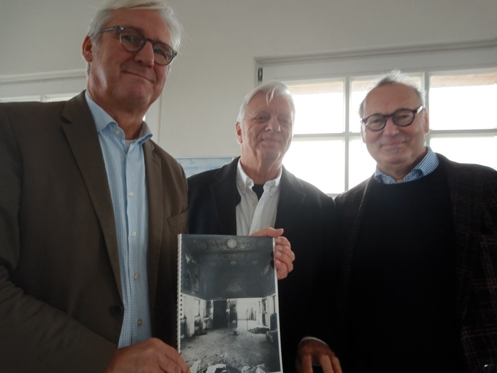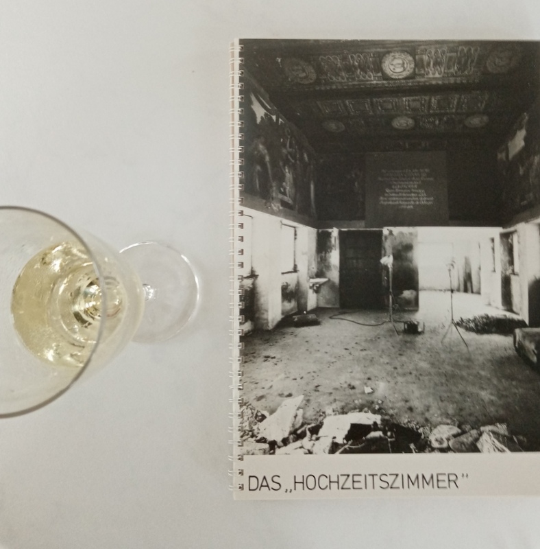 Die Schäden, die die Bomben der Brandnacht 1944 am Hochzeitsturm angerichtet hatten, waren zwar in den fünfziger Jahren notdürftig repariert worden, auch das komplett zerstörte Fünf-Finger-Kupferdach war wieder gedeckt, die mechanische Turmuhr restauriert und montiert, so dass das Gebäude in seiner Substanz nicht verfiel. Doch ansonsten lag alles im tiefen „Dornröschenschlaf“, aus dem es der Förderkreis in den Achtziger Jahren erwecken sollte. Es wurde auch höchste Zeit: Denn nach einem Rohrbruch in den Siebziger Jahren lösten sich im heutigen „Hochzeitszimmer“ schon langsam Teile des Stucks von der Decke. Zur Jubiläumsfeier mit Laudator Partsch (li.) hatten Alfred Helfmann (mi.) und der amtierende Vereinsvorsitzende Armin Riegel (re.) nicht nur viel Sekt, sondern auch einige Schwarz-Weiß-Aufnahmen mitgebracht von der Ausgangssituation, die man damals im Innern des Hochzeitsturms vorfand.