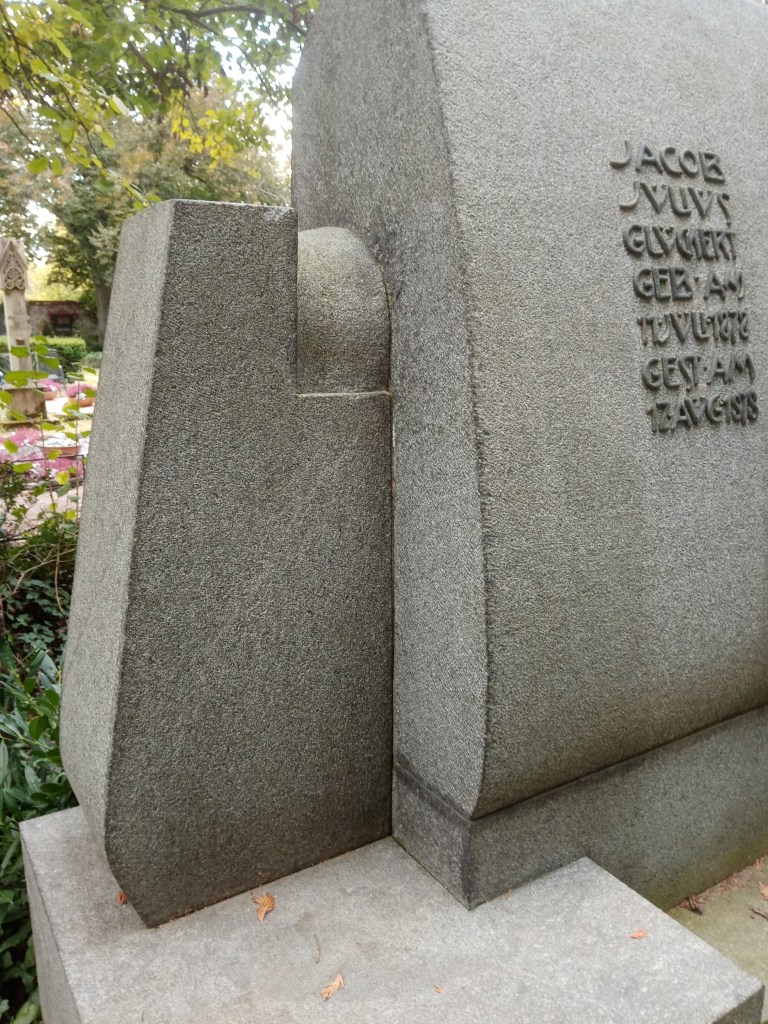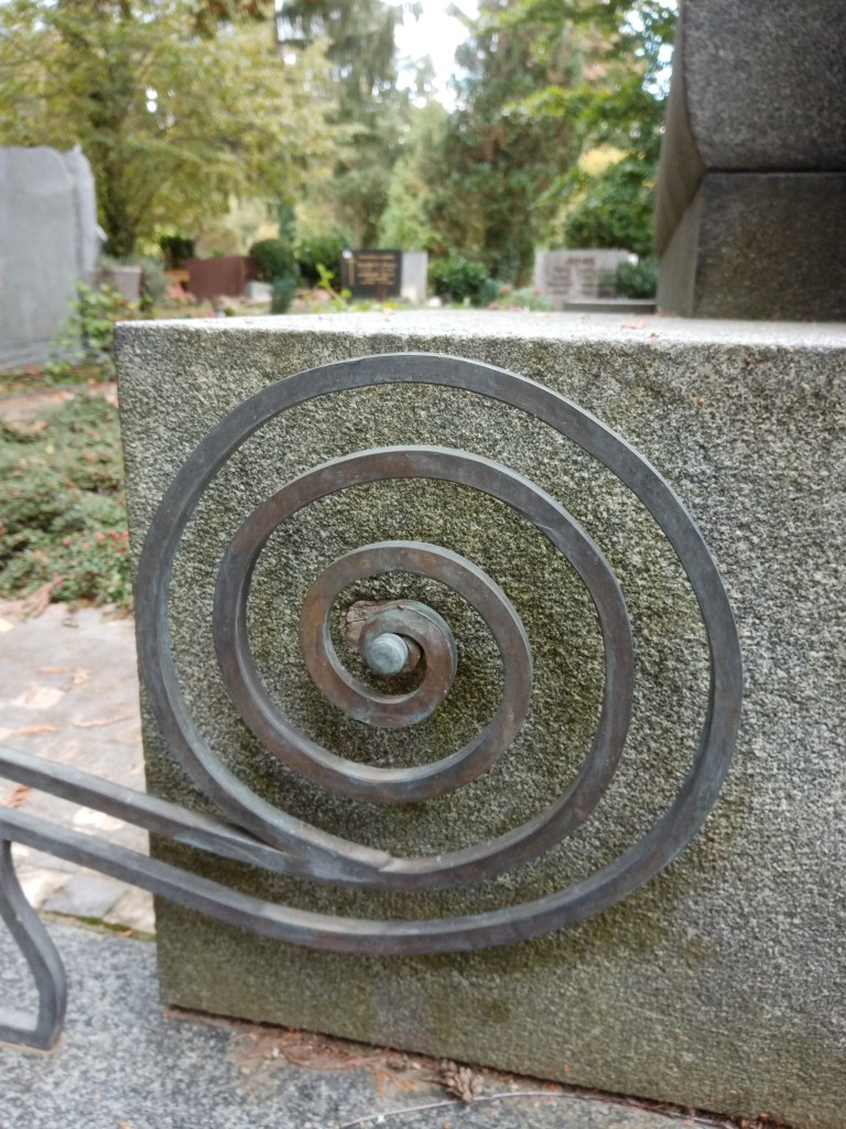 Der Grabstein aus Granit wirkt von weitem wie ein aufgestelltes Kissen, das sich über dem breiten Bett der Gräber erhebt. Die Form ergibt sich bei Olbrich oft aus der Funktion. Die Funktion eines Grabes ist es, in ihm auf ewig zu ruhen. Eine Ruhestätte mit steinernem Kissen, so könnte man die von Olbrich daraus abgeleitete Form interpretieren. Flächig gehalten ist der Stein, auch die seitlichen Einfassungen. Die einzige Dekoration auf der glatten Fläche kommt von den aufgesetzten bronzenen Lettern der Grabinschriften. Da ist kein Relief eingemeißelt, keine Säule zur Zierde gehauen. Bekannt kommt einem auch das Schachbrettmuster des Bodens vor, das Olbrich gerne als gestalterisches Element innen wie außen einsetzte. Und nicht zuletzt an den spiralförmigen Enden der Einfassung aus Schmiedeeisen erkennt man den Olbrich’schen Jugendstil zur Jahrhundertwende.