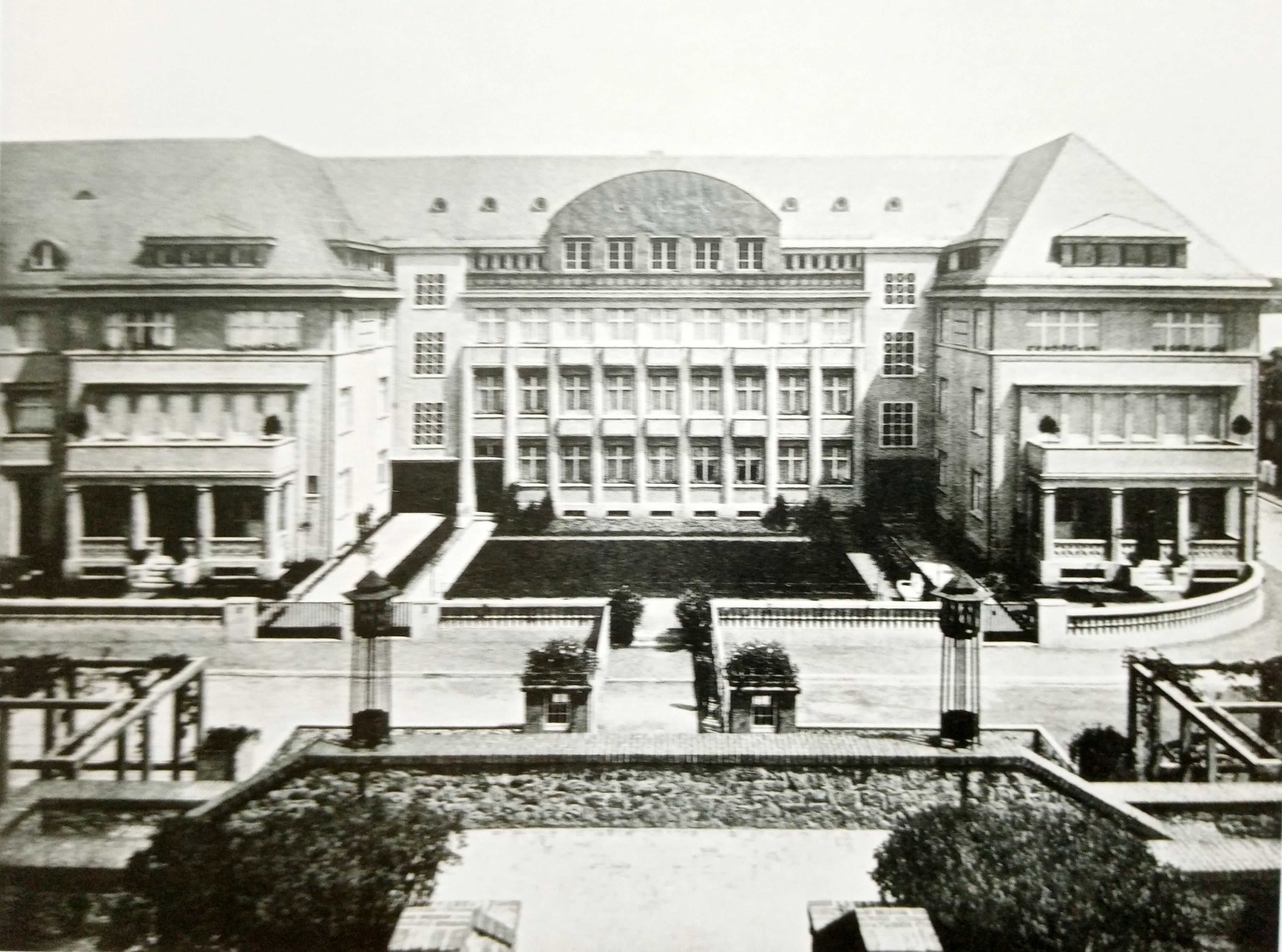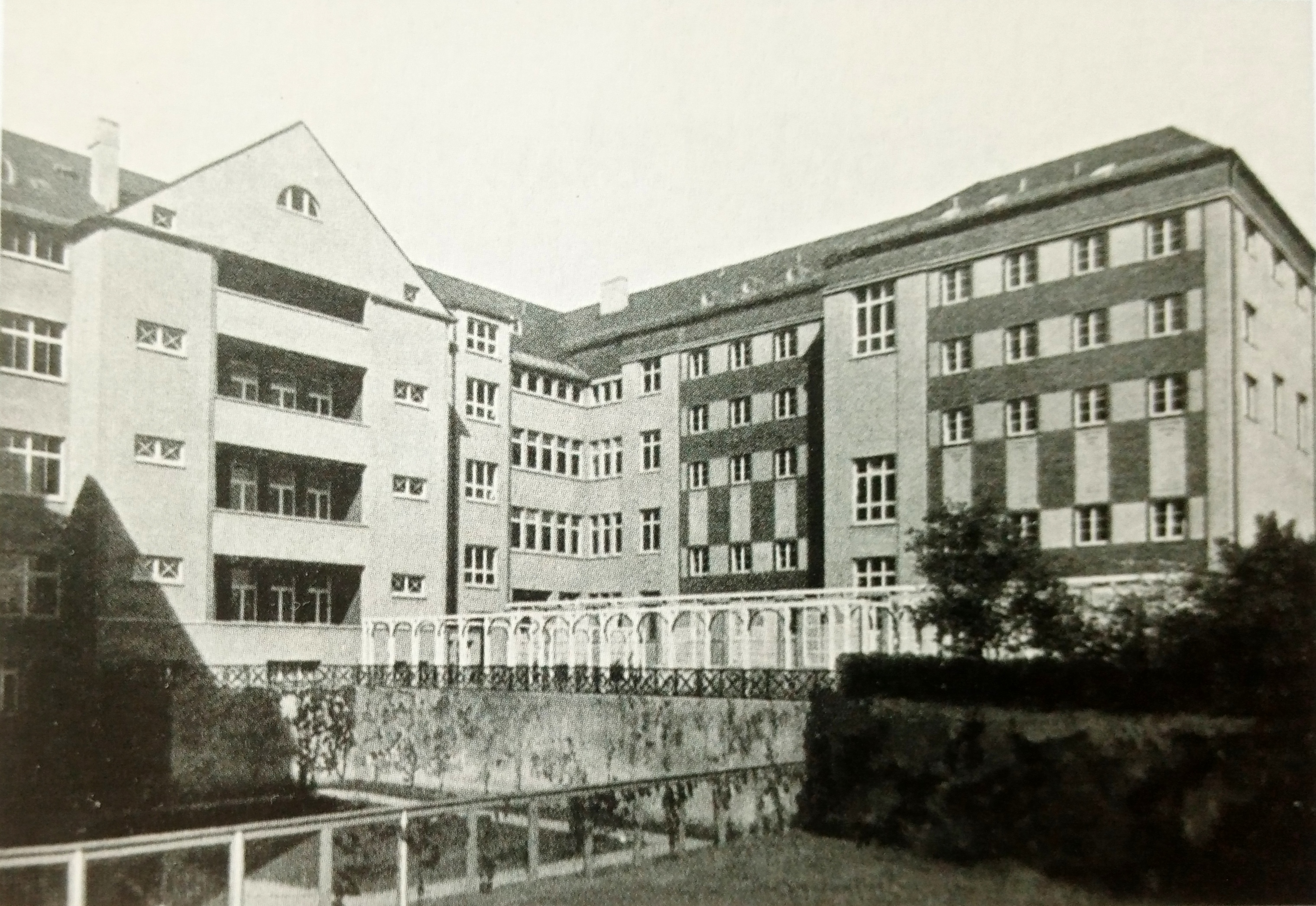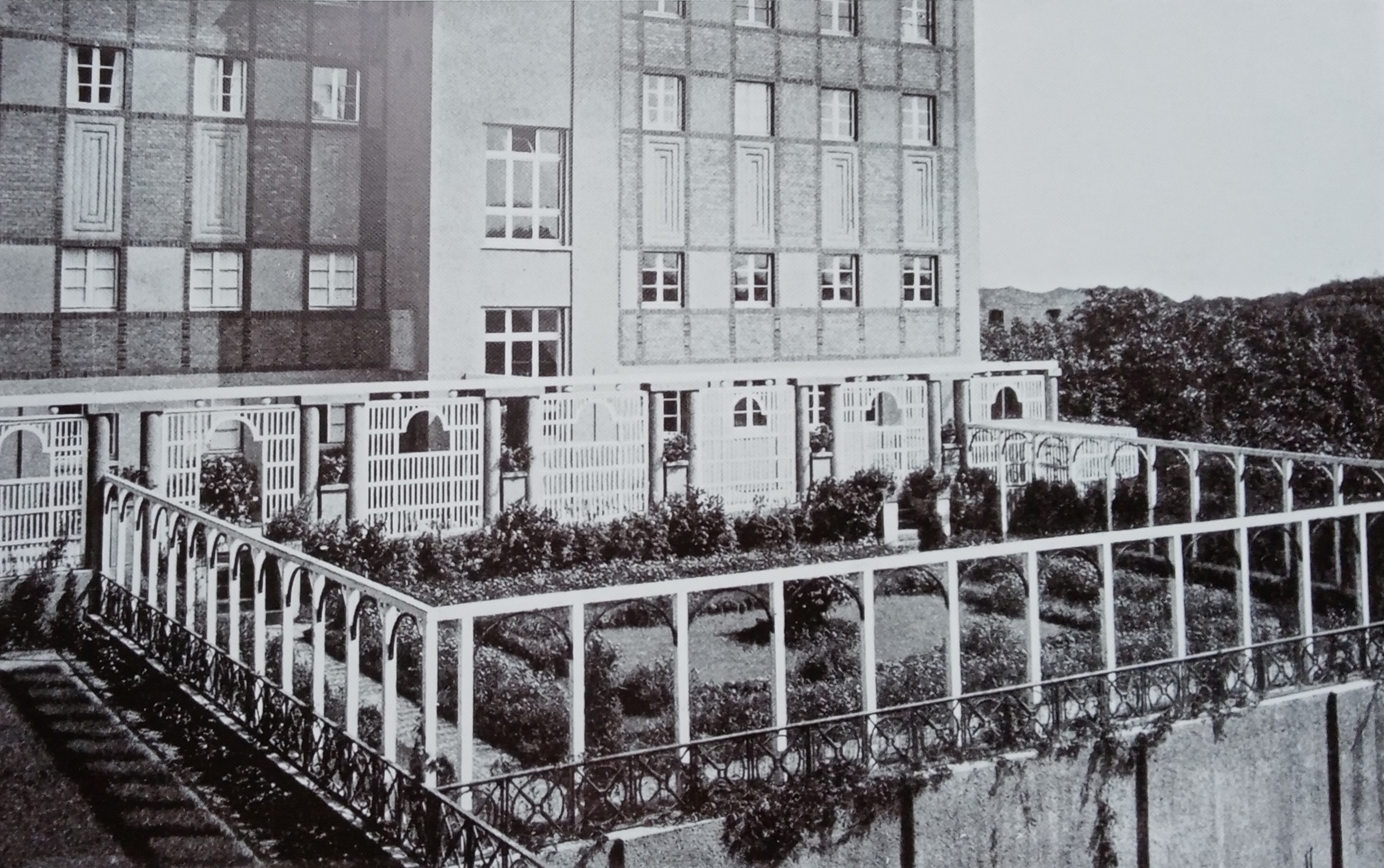 Genau gegenüber der Treppenanlage des Ausstellungsgebäudes befand sich ein kleiner, zentral auf diese ausgerichteter Platz, der von einem U-Förmigen Gebäude umgeben war. Die Wohngebäude links und rechts des Platzes liefen in zwei langen Schenkeln den Osthang hinunter und rahmten wiederum einen Innenhof.