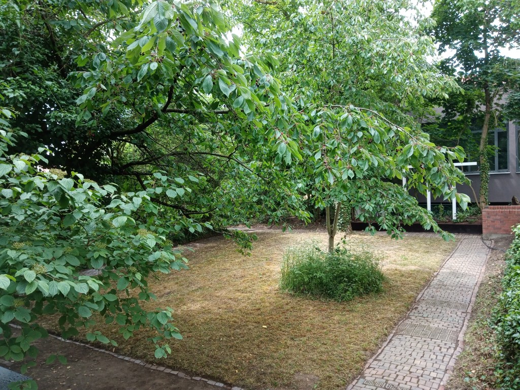 Doch! Denn mit dem Ateliergarten vor dem Gebäude blieb auch ein Stück moderner Gartenkunst von 1914 erhalten. Die städtische und hessische Denkmalpflege hat diesen Garten nach vielen Jahrzehnten wiederentdeckt und letztes Jahr zum UNESCO Welterbetag erstmals der Öffentlichkeit präsentiert. Vor allen Dingen mit dem Bau des neuen Besucherzentrums am Osthang, das vor Ateliergebäude und -garten nun eine große Freifläche vorsieht, werden beide bald verstärkt im Blickpunkt stehen. Lassen wir also jetzt schon Mal den Blick schweifen ins grüne Carrée, auch zurück in seine Vergangenheit zu Zeiten der Künstlerkolonie Darmstadt.