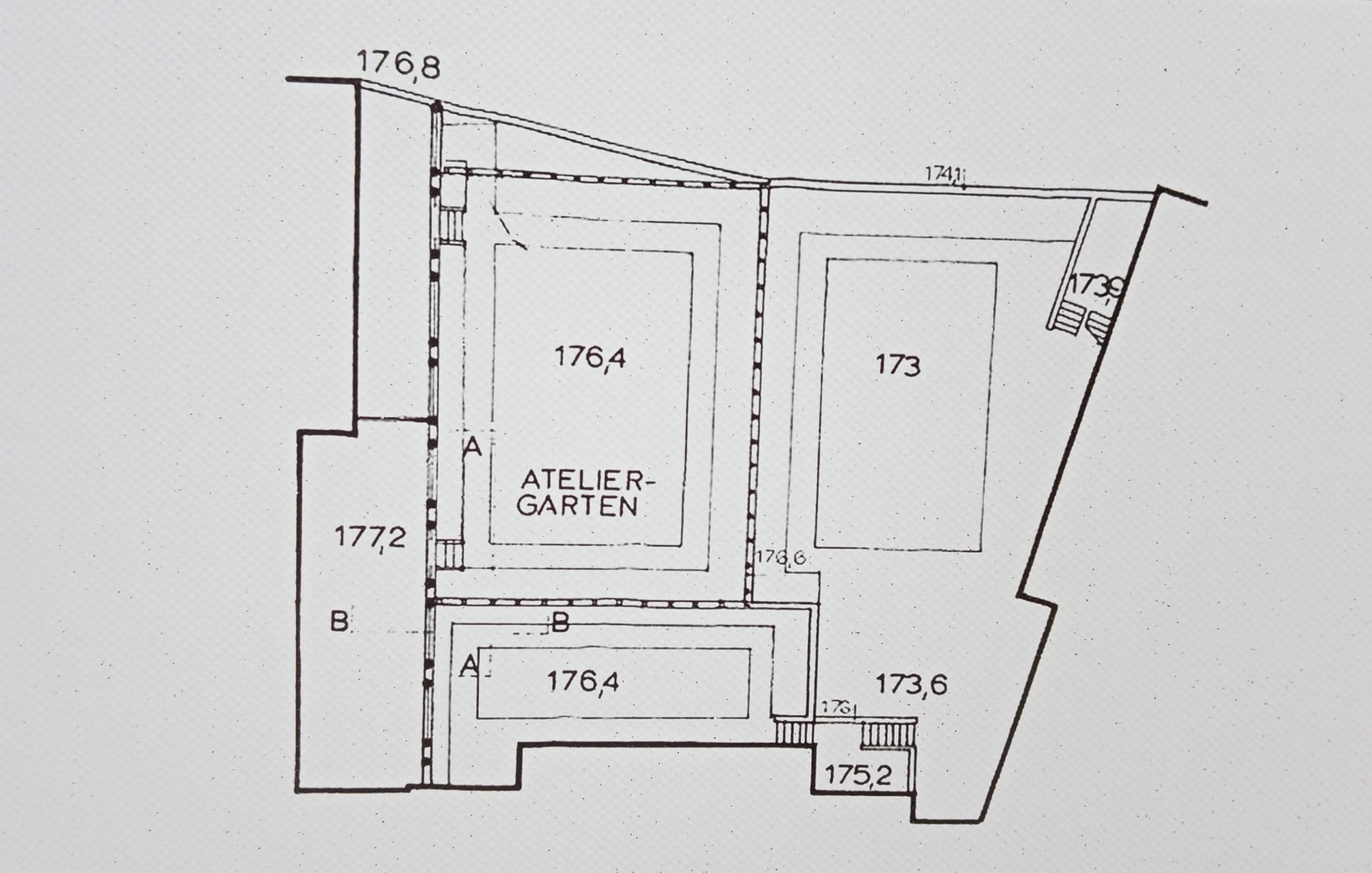 Der Ateliergarten war von weiteren Höfen umgeben, die sich der abschüssigen Lage des Geländes anpassten. Es gab am Osthang insgesamt noch vier weitere Gärten auf unterschiedlichen Höhenniveaus und von unterschiedlicher Größe, die über Treppen erschlossen wurden. Zum Süden hin bildete eine hohe Betonmauer den Abschluss des Ateliergartens zu einem drei Meter tiefer gelegen Garten. Auf der Mauer war vor den Pergolen ein niedriger Zaun aus grünem Gusseisen angebracht, der sich seitlich fortsetzte.