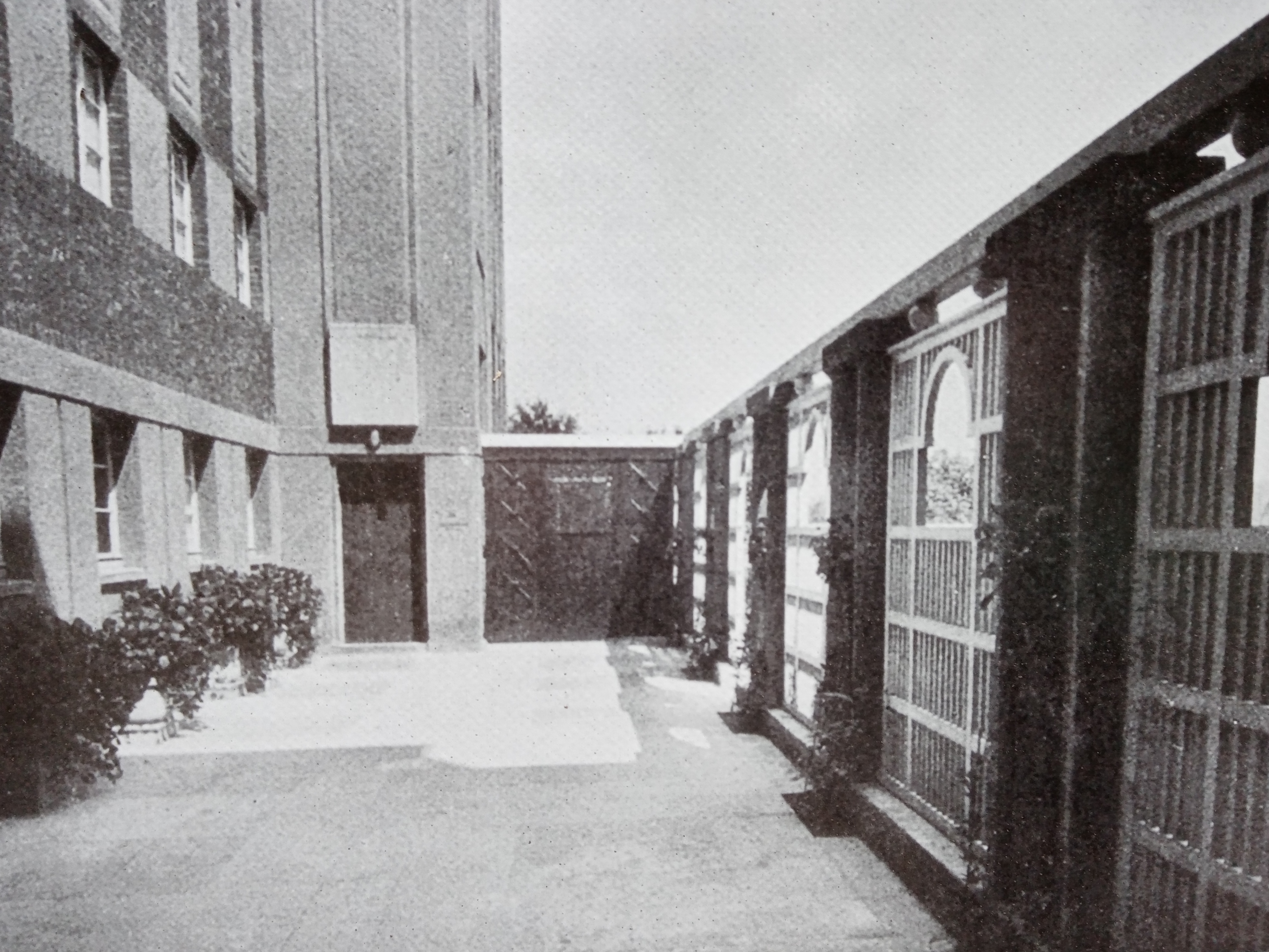 Dieser Innenhof befand sich auf der Rückseite der Miethausgruppe und wurde eingefasst von dem quer dazu stehenden Gebäuderiegel auf dem Osthang, dem „Ateliergebäude“ mit seinem markanten Backstein. Die Grundrisszeichnung zeigt die Aufteilung der auf der sonnigen Südseite gelegenen Freiflächen.