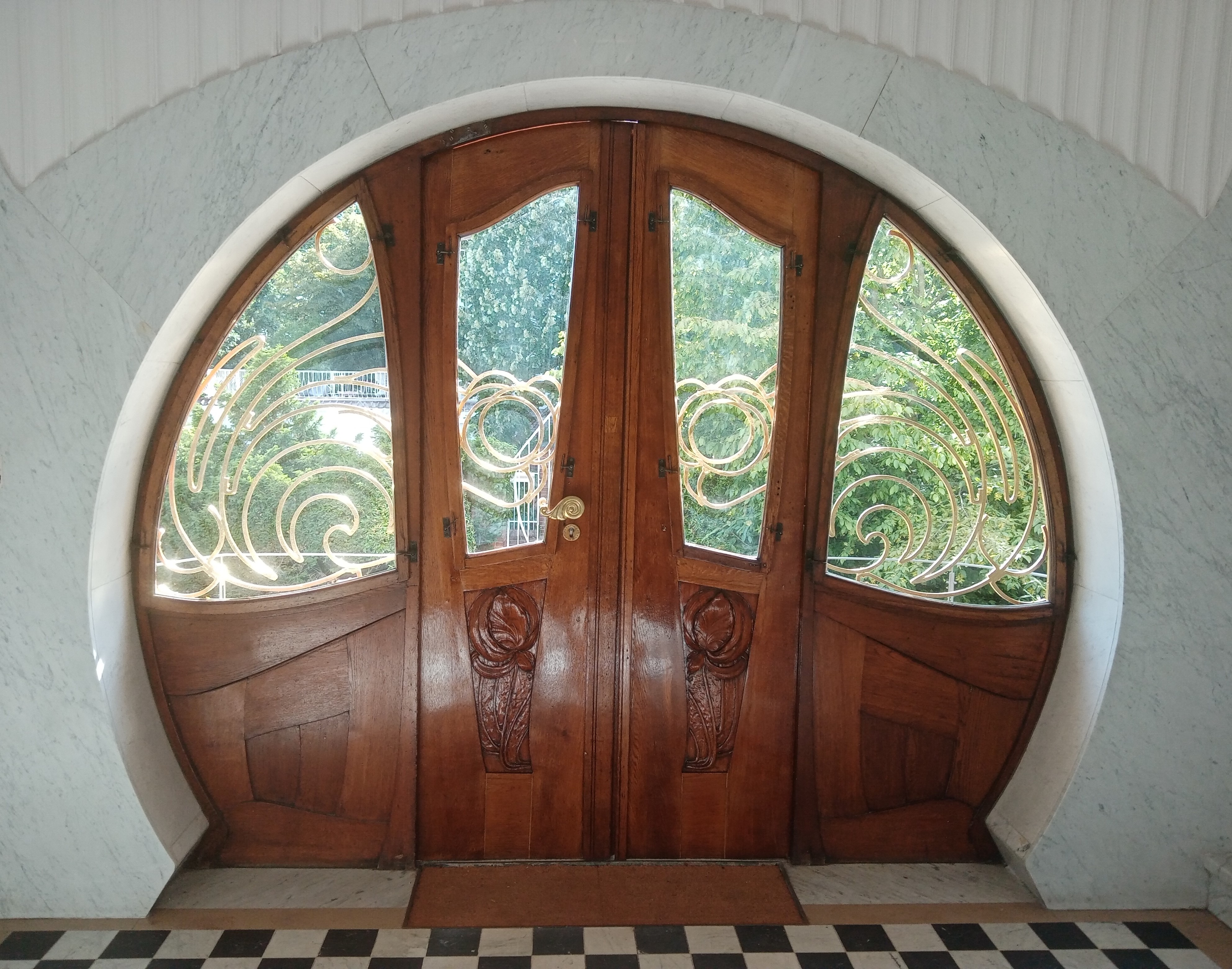 Reihe 1: Ernst Ludwig-Haus – Blick auf Olbrichs moderne Dachlandschaft mit Oberlichtern (li.), Bildhauerateliers – Seiteneingang mit Metallbogen von Olbrich (re. o.), Ausstellungsgebäude und Ernst Ludwig-Haus – Hangansicht vom Obergeschoss des Großen Haus Glückert aus gesehen (re. u.); Reihe 2: Großes Haus Glückert – Eingangstür von Innen, nach Sanierung (li. o.); Ausstellungsgebäude – neuer Glasbau zum Hochzeitsturm (li. u.), Ausstellungsgebäude – Blick von Innen Richtung Westen, nach Sanierung (re.); Reihe 3: Pergolen am Haus Olbrich – Durchgang vom Alexandraweg hinauf zum Olbrichweg (li.), Ausstellungsgebäude – Blick vom unteren Eingang zum Wasserspeicher durch die Pergolen auf den Hochzeitsturm (re.). | Fotos: 23 Quer, Petra Wochnik.