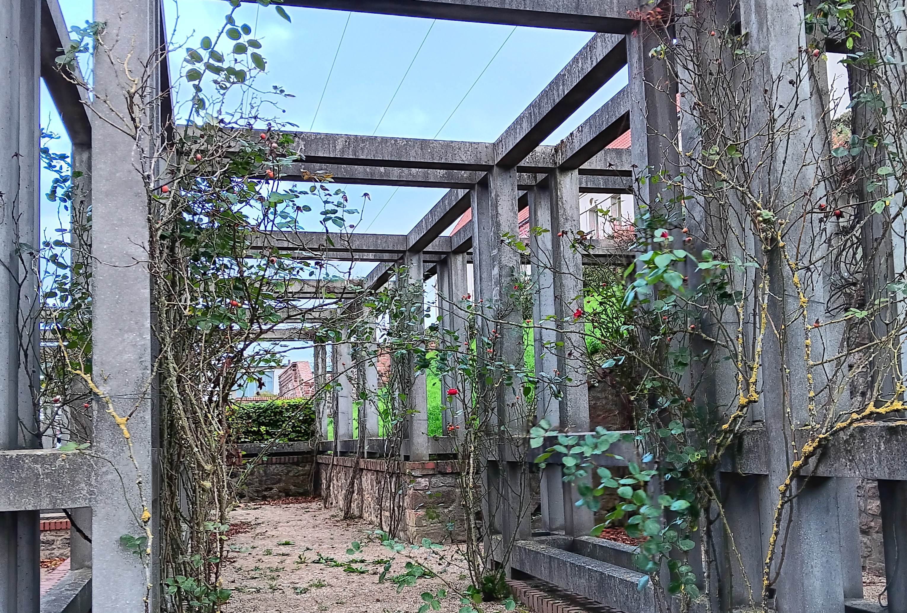 Nun, der anstehende Winter ist nicht gerade die ideale Zeit, um unter Rosen flanieren zu gehen. Aber noch eine einzige, tapfer blühende, leuchtet mit der ganzen Krafts ihres Rots gegen den herbstlichen Himmel an. Im Sommer rankt und blüht es hier überall. Umgeben von Rosenduft geht es durch meterlange Pergolen immer die Rückseite des Ausstellungshügels entlang. Die letzten Jahre war dieses wegen der Baustelle und den vielen Bauzäunen leider nicht möglich. Aber das wird sich ja bald alles ändern. Spätestens im Frühjahr 2024 werden Besucher von hier wieder durch viel Grün hinauf auf den Hochzeitsturm blicken können, der auch von hinten nichts von seiner Spannung verliert.
