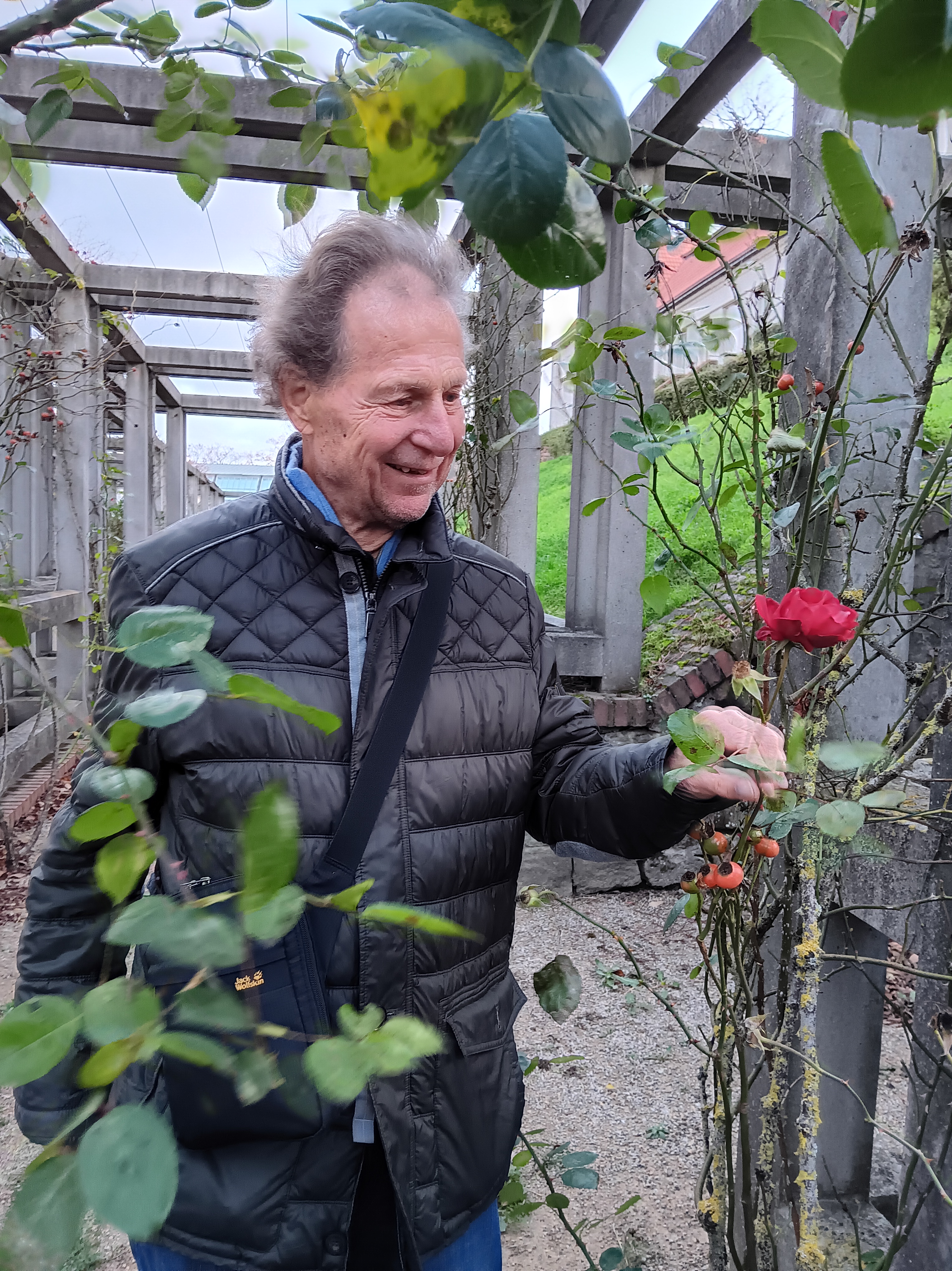 Hans Gerhard Knöll freut sich sehr über diese letzte Rose des Jahres, ihren Duft. Doch auch hier kommt bei ihm das Ingenieursherz wieder durch. Er denkt sogleich an das besondere Material, aus dem die Pergolen rund um den gesamten Hügel von Ausstellungsgebäude und Hochzeitsturm herum gefertigt wurden: aus Eisenbeton, der pro Säule oder Balken jeweils vier Armierungseisen besitzt. Eisenbeton setzt uns heutzutage vielleicht nicht mehr so in Erstaunen, war aber Anfang des 20. Jahrhunderts ein neuer Baustoff, mit dem auch Olbrich auf der Mathildenhöhe bereits früh experimentierte. Er hatte sogar schon daran gedacht, den Hochzeitsturm aus Beton zu bauen, was die Statiker vom Bauamt in Darmstadt allerdings sehr kritisch sahen. So wurde er aus bewährtem Backstein hochgezogen.