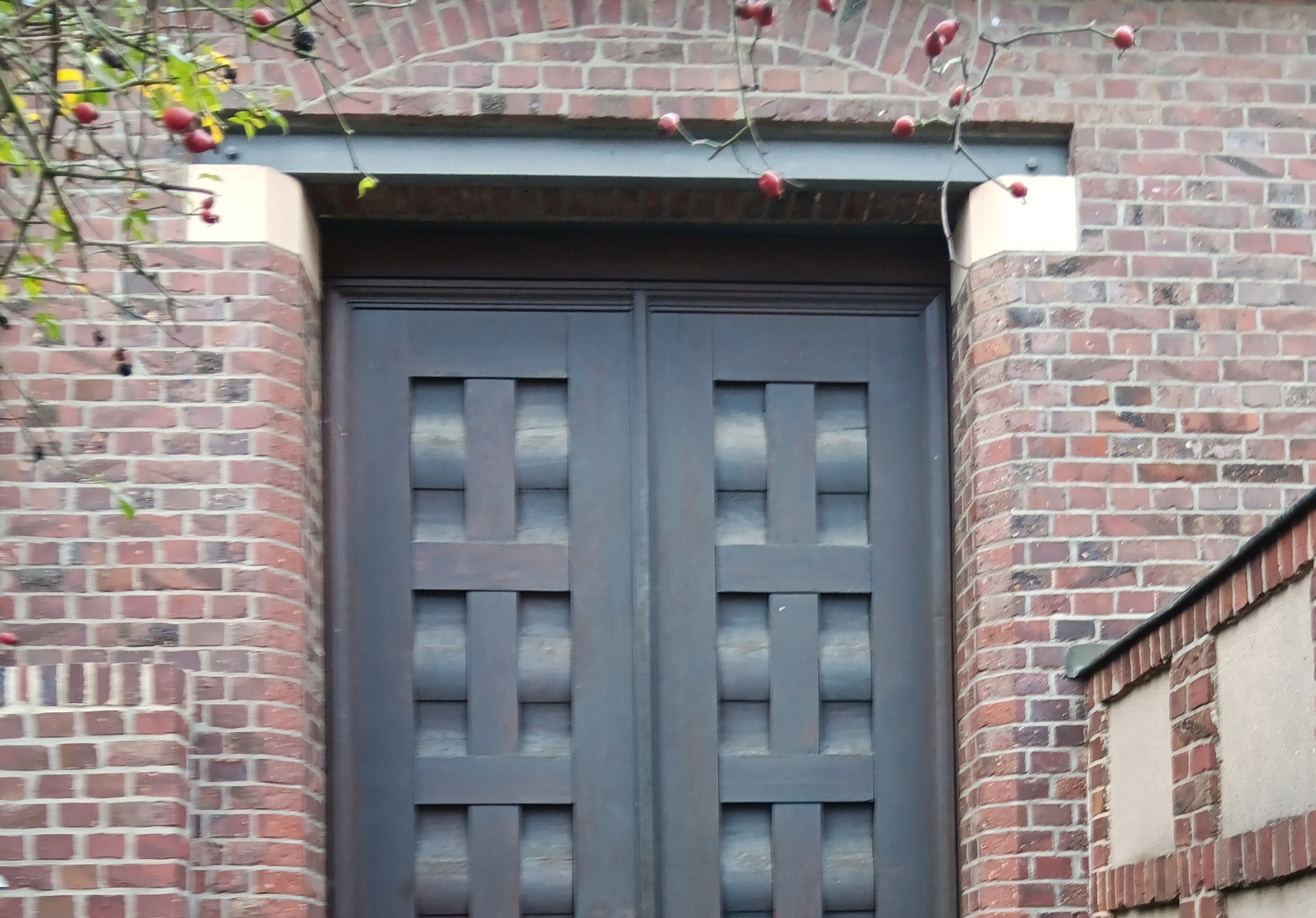 Auch das Sichtbar machen tragender Elemente ist an den Gebäuden der Künstlerkolonie schon ganz früh zu beobachten: etwa am „Haus Deiters“ bei den Erdgeschossfenstern 1901 oder am Eingangstor zu den Bildhauerateliers im Backsteinanbau des Ernst Ludwig-Hauses 1908.