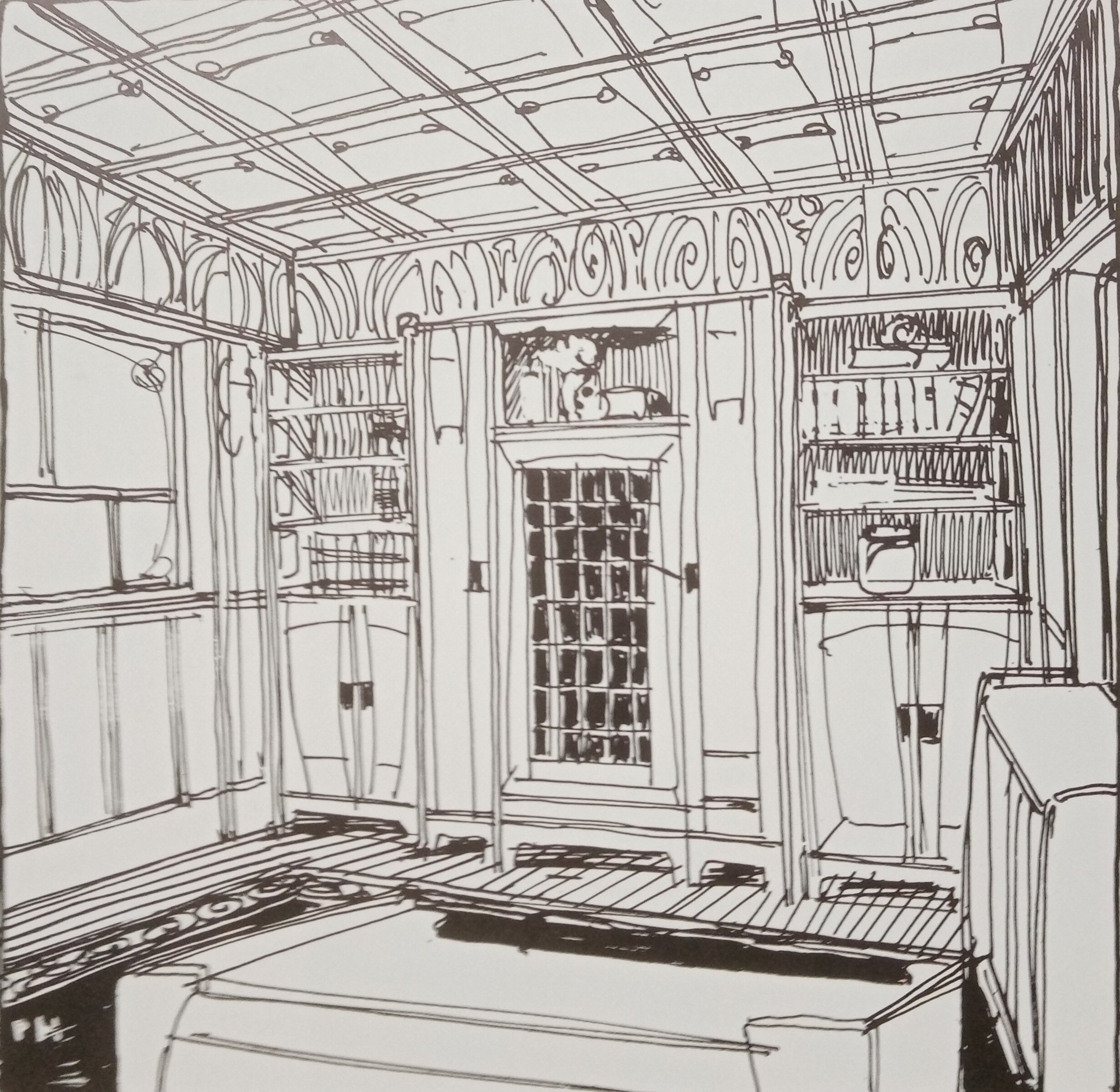 Zum UNESCO-Weltkulturerbe auf der Mathildenhöhe Darmstadt gehört alles, was nicht mobil ist: Gebaut muss etwas sein, fest an einem Platz stehend, unbeweglich. Dazu gehören selbstverständlich die Architektur, die Skulpturen und die Gestaltung des Außengeländes. Dazu gehört aber auch die Inneneinrichtung der Gebäude, sofern sie fest eingebaut und damit Innenarchitektur ist: Wandvertäfelungen, Wandschränke, Balken und Deckenkonstruktionen aus Holz sowie alle Arten und Sorten der sehr beliebten Einbaumöbel.