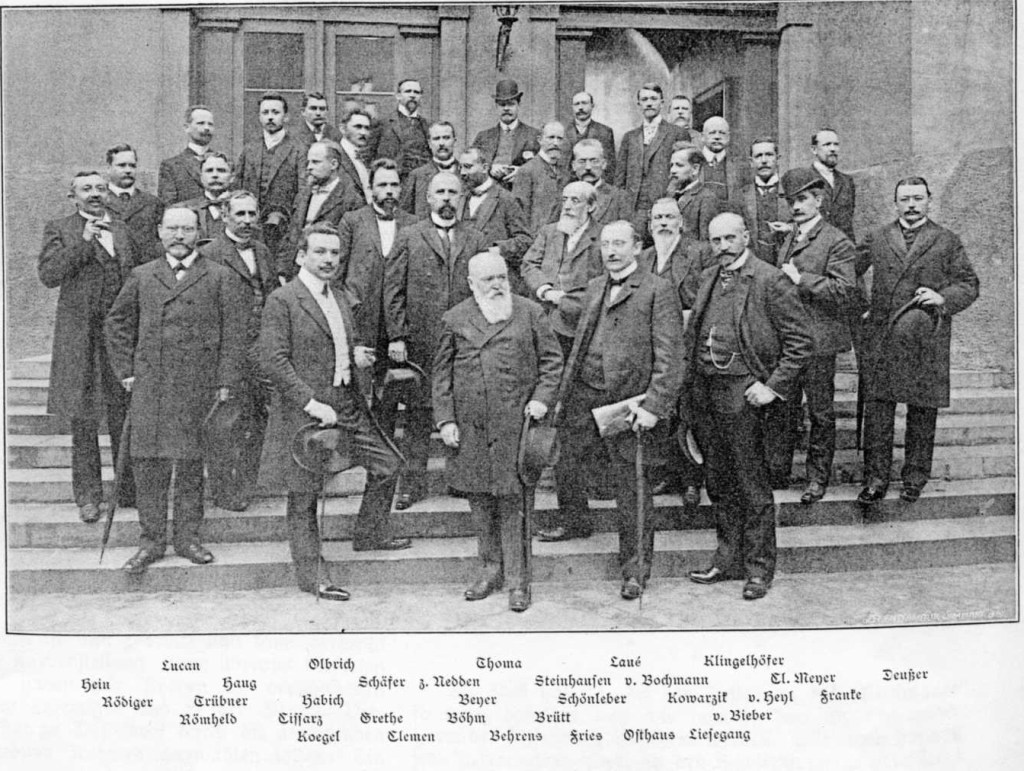 Mit Olbrich traf sich Maximilian von der Heyl nicht nur zum Tee, sondern auch als Mitglied des im Januar 1904 in Düsseldorf neu gegründeten Verbands „Kunstfreunde am Rhein“. Dessen erste Tagung fand im Mai des gleichen Jahres in Darmstadt statt. Großherzog Ernst Ludwig war Schirmherr des Verbands, dem neben Olbrich auch Peter Behrens angehörte, der zu dieser Zeit Darmstadt bereits verlassen hatte und Direktor der Kunstgewerbeschule in Düsseldorf war. Anlässlich dieser Tagung entstand dieses Gruppenbild, das vor der Kunsthalle aufgenommen wurde: Olbrich ist ganz vorne in der ersten Reihe zu sehen, Behrens in der letzten, Maximilian von Heyl in der dritten, der zweite von rechts.