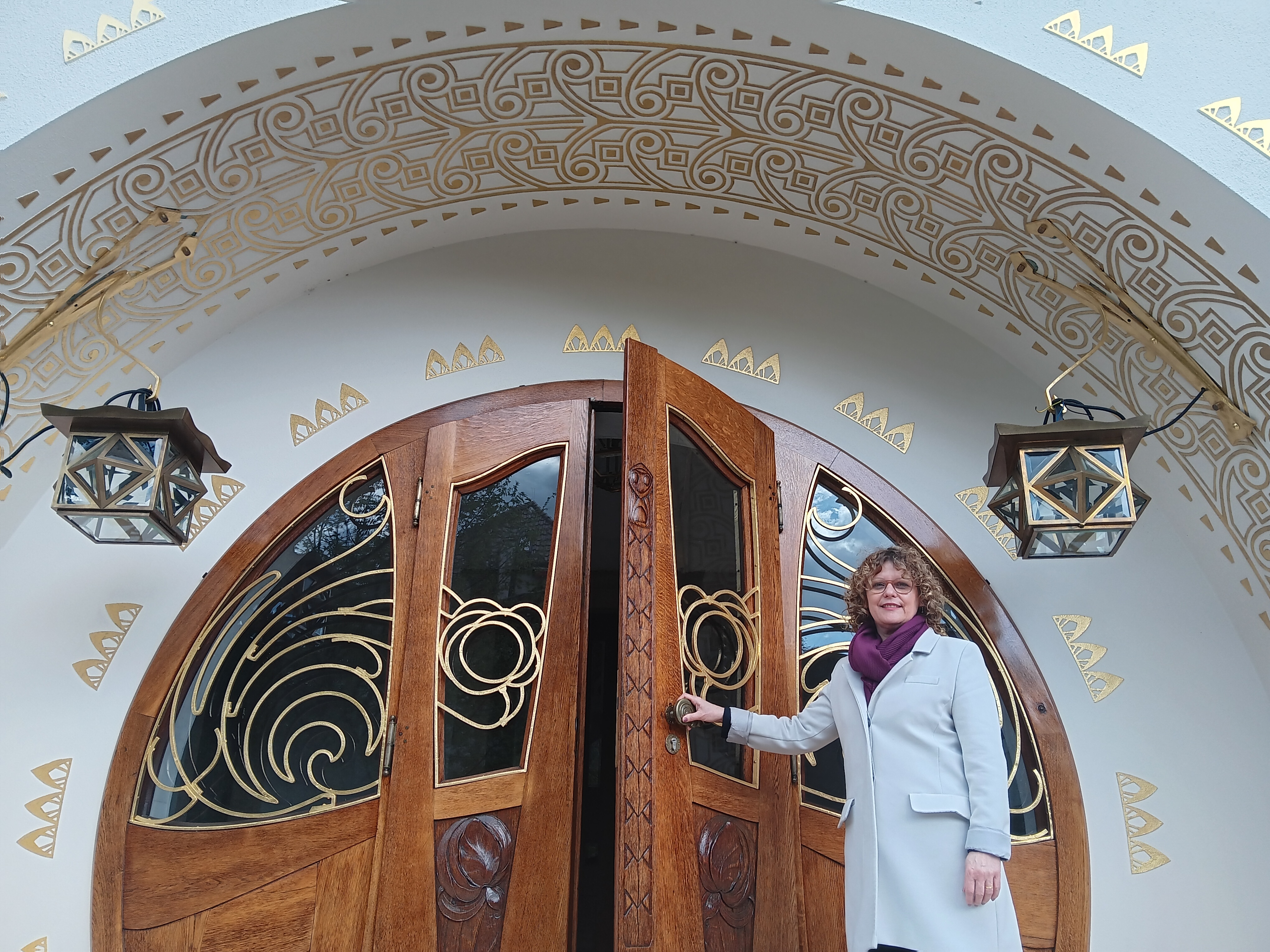 Zugänglich ist die von Joseph M. Olbrich gebaute Jugendstilvilla nur im Rahmen von geführten Rundgängen von Darmstadt Marketing oder spezieller Veranstaltungen. Gesichert sind Tor und Eingang durch viele Schlösser. Und mit dem Großen Haus Glückert hatte auch Anja Herdel ihre erste „Schlüsselerfahrung“ auf der Mathildenhöhe. Gut 30 Jahre ist es mittlerweile her, dass sie als junge Frau zum ersten Mal den Schlüssel für diese herrliche Jugendstilvilla in den Händen hielt. Als Gästeführerin. Denn damit ging für sie, die sich in ihrem Studium auch mit Baugeschichte auseinandergesetzt hatte, 1993 ihre Karriere bei der Stadt Darmstadt los. Sie erinnert sich: „Ich wurde zu dieser Zeit gebeten, im Großen Haus Glückert die Aufsicht für einen Tag zu machen. Stunden habe ich auf dem von Olbrich eingebauten Stuhl an der Holztreppe links neben dem Kamin gesessen.“