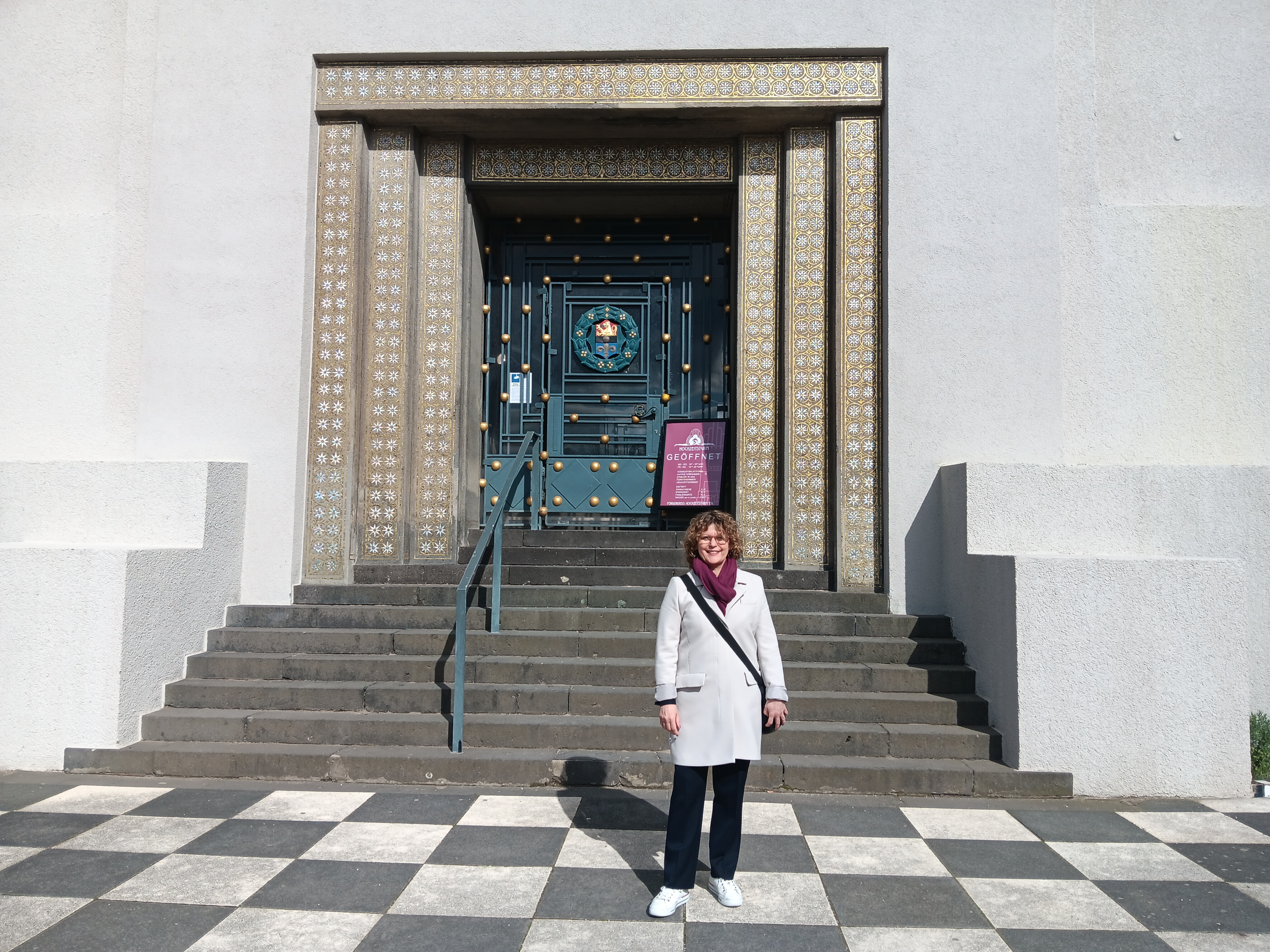 Damals erstrahlte dieser Bau noch nicht so schön und mit so viel goldenen Ornamenten und Gittern versehen wie heute nach der umfangreichen, jahrelangen Sanierung durch den Denkmalschutz. Olaf Köhler, der Leiter der Darmstädter Denkmalpflege, kennt diesen Prachtbau, der so sehr an den Wiener Jugendstil erinnert, den Olbrich mit nach Darmstadt brachte, wie wohl kein anderer. Für die Sanierung der Stuckdecken im obersten Stockwerk gab es für ihn und seine Mitarbeiter 2023 den Denkmalschutzpreis des Landes Hessen. Soweit unters Dach flanieren wir heute nicht, aber bestimmt mal mit Olaf Köhler, der lachend seine Kollegin im Amt am schmiedeeisernen Tor vor dem einzigartigen Omega-Portal begrüßt.