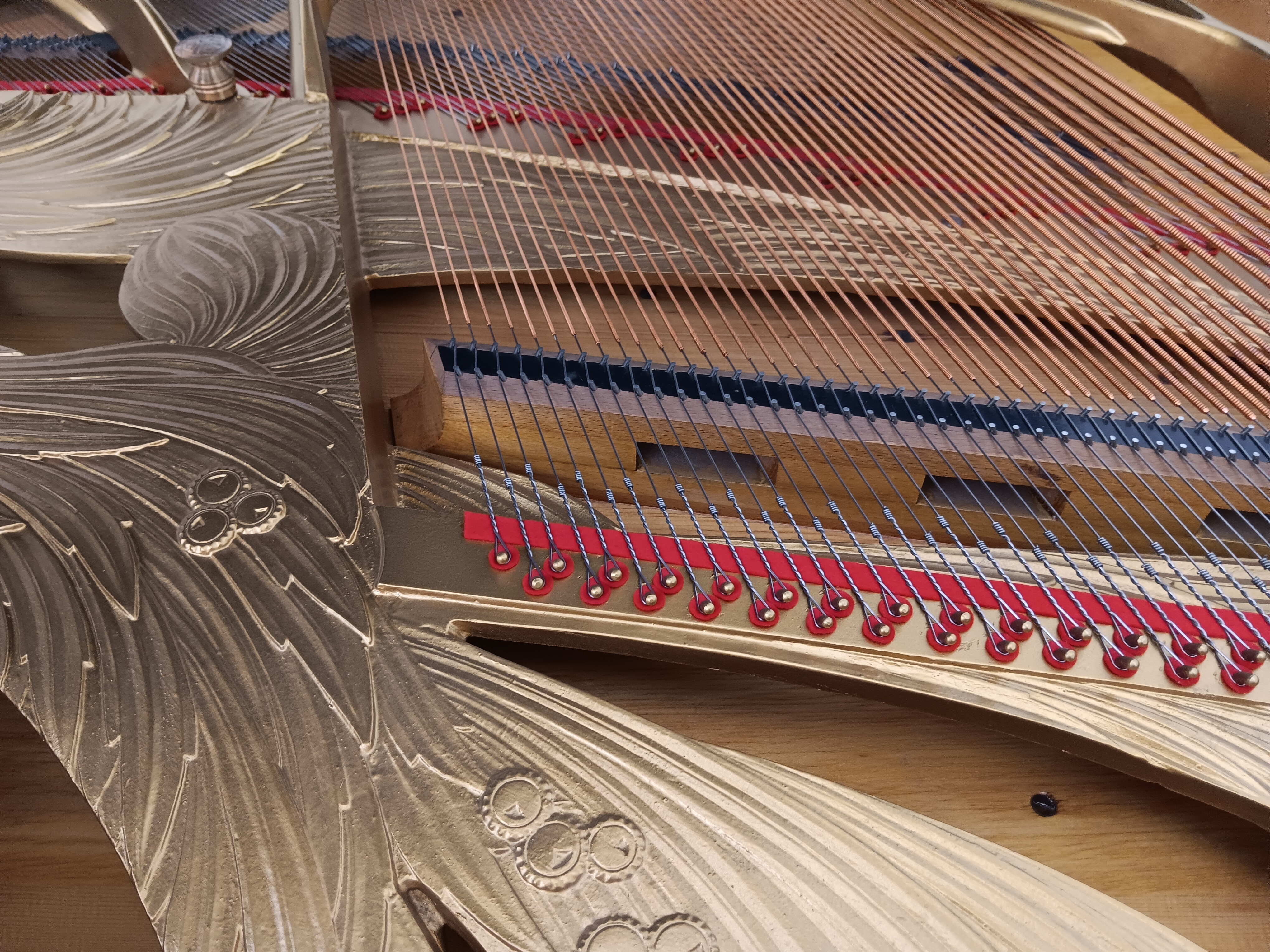 Der Gestaltungwille der Künstlerkolonie Darmstadt umfasste viele Bereiche des Lebens und machte auch vor der Musik nicht halt. Insbesondere reizte der Flügel als ein Musikinstrument, das viel Fläche für ornamentalen Schmuck bietet, zur künstlerischen Bearbeitung. War ein Flügel doch integraler Bestandteil der Wohnkultur großbürgerlicher Kreise, gehörte ein repräsentatives Musikzimmer zur Ausstattung eines jeden kunstbeflissenen Hauses. Ein solches besaß selbstverständlich auch Großherzog Ernst Ludwig in seinem Neuen Palais, das sich ehemals auf dem heutigen Georg-Büchner-Platz vor dem Staatstheater befand. Dort stand ab 1906 ein ganz besonderes Tasteninstrument: der „Olbrich-Mand-Flügel“. Erstmals öffentlich vorgestellt wurde er zur ersten Ausstellung der Künstlerkolonie von 1901 auf der Mathildenhöhe.