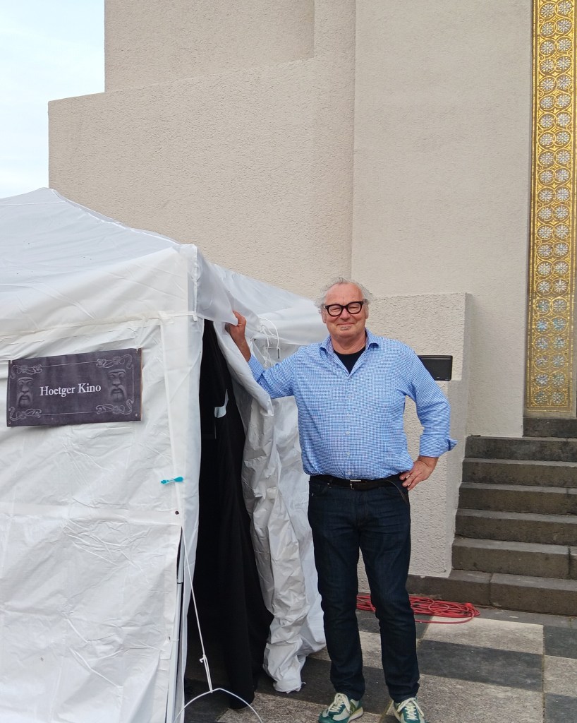 Es war ganz großes Kino, was die Stadt Darmstadt mit dem Welterbefest Mathildenhöhe auf die Beine gestellt hat. Richtig begeistert war 23 Quer aber auch von einem ganz kleinen vor dem Eingang zum Hochzeitsturm: dem „Hoetger Kino“. Ein weißer Pavillon von drei mal drei Metern, darin ein paar Stühle und ein Bildschirm. Zu sehen gab es eine Filmpremiere der besonderen Art: die „Hoetger Geheimnisse erzählt von Dr. Tino Wehner“. Ein kleines Filmjuwel, produziert vom Förderkreis Hochzeitsturm, das mit vielen Geschichten und Details zur Entstehung der Skulpturen im Platanenhain zu überraschen weiß.