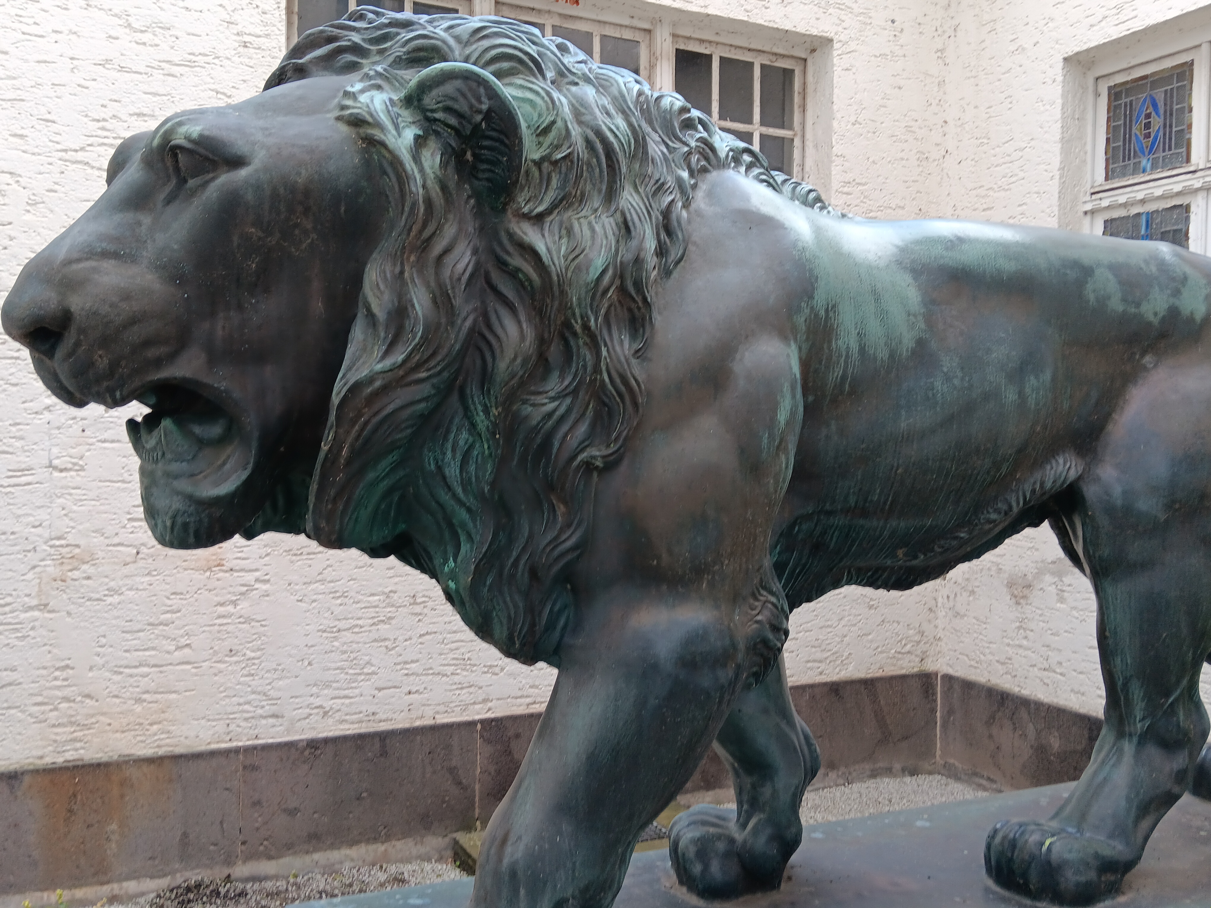 Den Gratulanten aus dem engsten Familienkreis schaut im kleinen Atrium vom Badehaus 3 ein Löwe aus Bronze über die Schulter. Dabei handelt es sich um keinen geringeren als den „Hessischen Löwen“, den Heinrich Jobst entworfen hat und der, 1912 in Bronze gegossen, zunächst in Darmstadt auf der Ausstellung der Künstlerkolonie 1914 in Darmstadt zu sehen war. Er war prominent in der Mitte des offenen Rosenhofs platziert, der sich damals dort befand, wo heute die Halle 4 des Ausstellungsgebäudes ist, und in dem mit 4-3-2-1 Darmstadt aktuell die erste Ausstellung nach Wiedereröffnung des Hauses präsentiert wird.