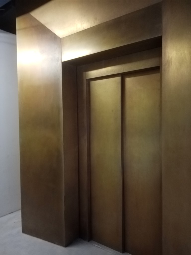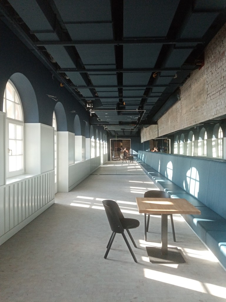 In Gold und Blau erstrahlt das neu eröffnete „CaféRestaurant Mathildenhöhe“: ganz wie im alten Ägypten oder eben auch wie im Platanenhain Hoetgers, der alles Ägyptische eine Zeit lang so sehr liebte. Das neue Schmuckstück im Erdgeschoss des Ausstellungsgebäudes ist seit gut drei Wochen eröffnet und zieht viele begeisterte Gäste an. Die Aufnahmen stammen aus der Zeit davor, ohne Publikumsbetrieb, und geben einen klaren Blick auf zwei dominierende Bauelemente: auf den Aufzug in Messinggold, der den barrierefreien Zugang ermöglicht, und auf den Restaurantbereich mit lang gestreckter blauer Polsterbank und einem wandhohen Spiegel ganz am Ende, der den Raum optisch erheblich streckt. Ein Hauch von elegantem Art déco durchdringt das gesamte Lokal, in spannenden Kontrast gesetzt zu Bereichen, in denen das alte Backsteinmauerwerk und seine Nutzung als ehemaliger Wasserspeicher noch aufblitzt.