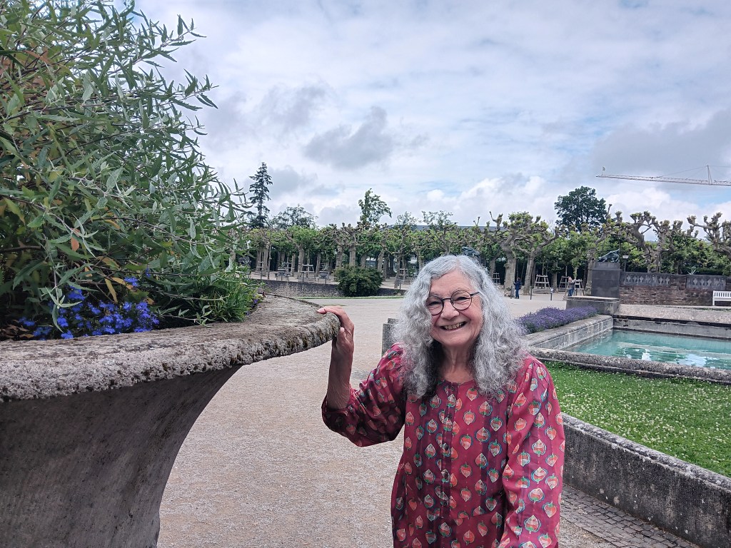Heidi Kriegbaum im Sommer 2024 am großen Blumenpokal von Albinmüller: Dank ihrer großzügigen Spende konnte 2019 diese auffallende Bildhauerarbeit am Rande des Lilienbeckens saniert werden. Seitdem läuft kein Wasser mehr an der Seite des Steinkübels heraus. Denn das war Heidi Kriegbaum bei einer ihrer Führungen über das Mathildenhöhengelände aufgefallen. Hier wollte und konnte sie ganz konkret Abhilfe schaffen. Auch wenn sie keinen besonderen Bezug zum zweiten Leiter der Künstlerkolonie Darmstadt, dem Architekten und Gestalter Albinmüller, gehabt habe, so Kriegbaum. Aber die Form und Gestalt der Vase haben ihr schon immer gefallen. Am Ende beliefen sich die Kosten auf rund 13.000 Euro, die sie komplett übernahm. Danke, Heidi Kriegbaum!