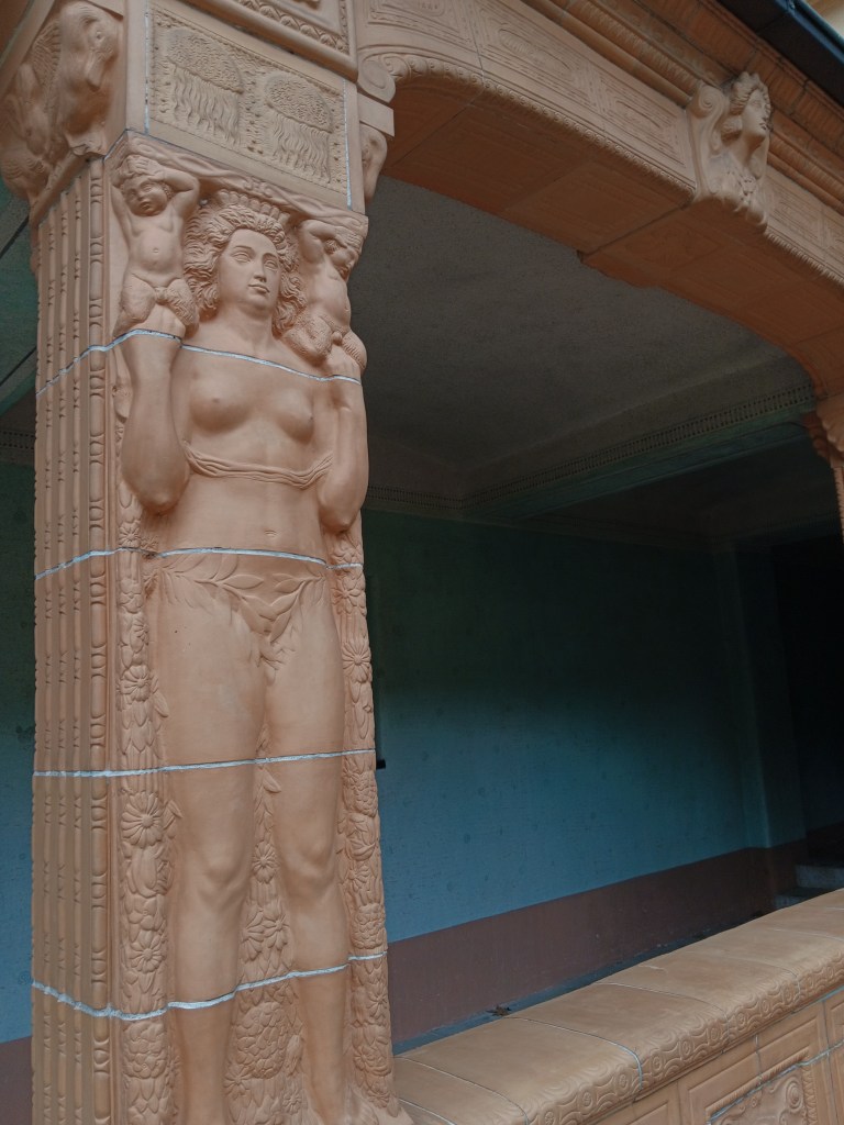 Es ist das letzte Badehaus im Rund der Arkaden: die Nummer 7 im Sprudelhof der historischen Badeanlage von Bad Nauheim. In der luxuriös ausgestatteten Wartehalle empfängt einen noch die Formenstrenge des Art Deco, doch gleich dahinter beginnt ein lustvolles Spielen und Treiben. Denn im Keramikhof von Heinrich Jobst springen Frösche über Bänke, tummeln sich Fische, kriechen Seeschlangen, und ein Brunnen mit nackten Nixen in anregenden Posen steigert das bukolische Lebensgefühl dieses ganz besonderen Badeorts. Für den Bildhauer der Künstlerkolonie Darmstadt war dieses 1907 sein erstes großes Projekt für Großherzog Ernst Ludwig, der ihn als Nachfolger von Ludwig Habich kurz zuvor an die Mathildenhöhe berufen hatte. Er war jung, 32 Jahre alt und sprühte vor Fantasie und Einfallsreichtum.
