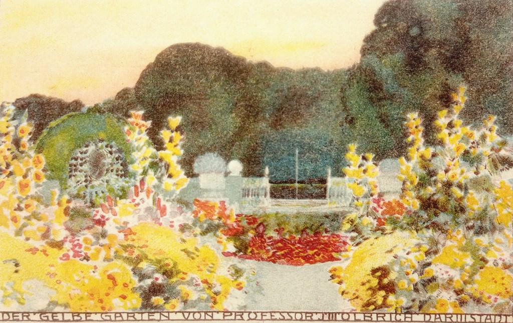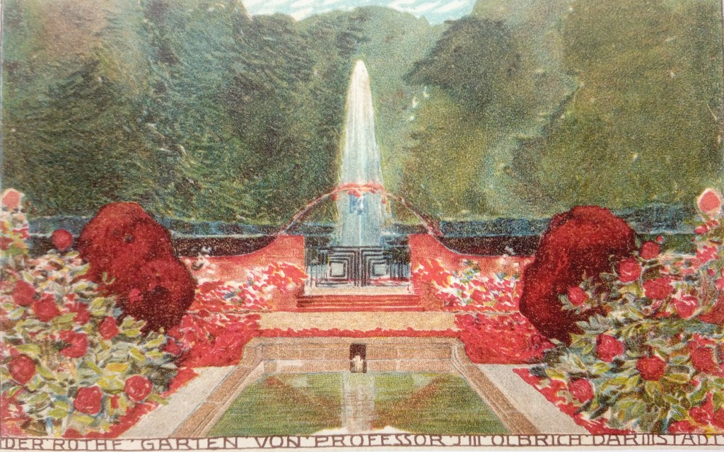Ein Traum von einem Garten zog sich 1908 den Hang hinauf zum Ernst Ludwig-Haus. Von einem als „Auge“ kreisförmig gestalteten Wasserteich ging es durch einen symmetrisch gestalteten Garten, an Rosenbüschen, Hecken und Buchsbaum in Kübeln vorbei, durch ein Spalier haushoher Pyramidenpappeln, Treppe um Treppe, Terrasse um Terrasse immer weiter hoch, bis man ganz oben angekommen war, am „Tempel der Arbeit“, dem der Kunst geweihten, ganz in Weiß und Gold strahlenden Heiligtum und Thron: dem Ateliergebäude der Künstlerkolonie.